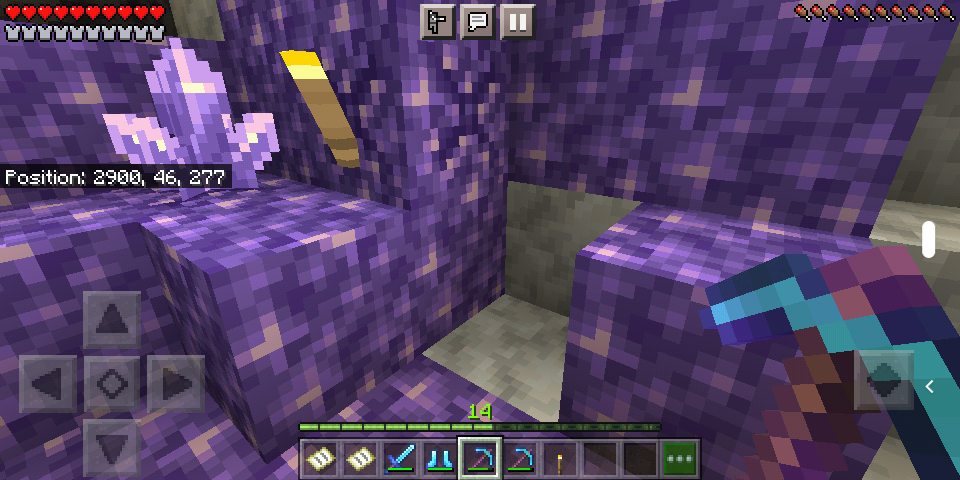 I've tried to break the budding amethyst with both a silk touch and a fortune 3 pickaxe (both of which have other enchantments on it) and in both scenarios it doesn't break. There are two images: one before the geode was broken and one after. As you can see, the torch-- which was placed onto the block in question-- was broken and collected into my inventory. However, the budding geode amethyst was broken and no item entity was generated. At the time the picture was taken, I had used my silk touch pickaxe, which also includes unbreaking 3, efficiency 4 and mending (in that order). The same problem occurs with my Fortune 3 pickaxe, which has unbreaking 3, mending, and efficiency 4 (in that order). The non-budding amethysts do however breack and I can collect them.