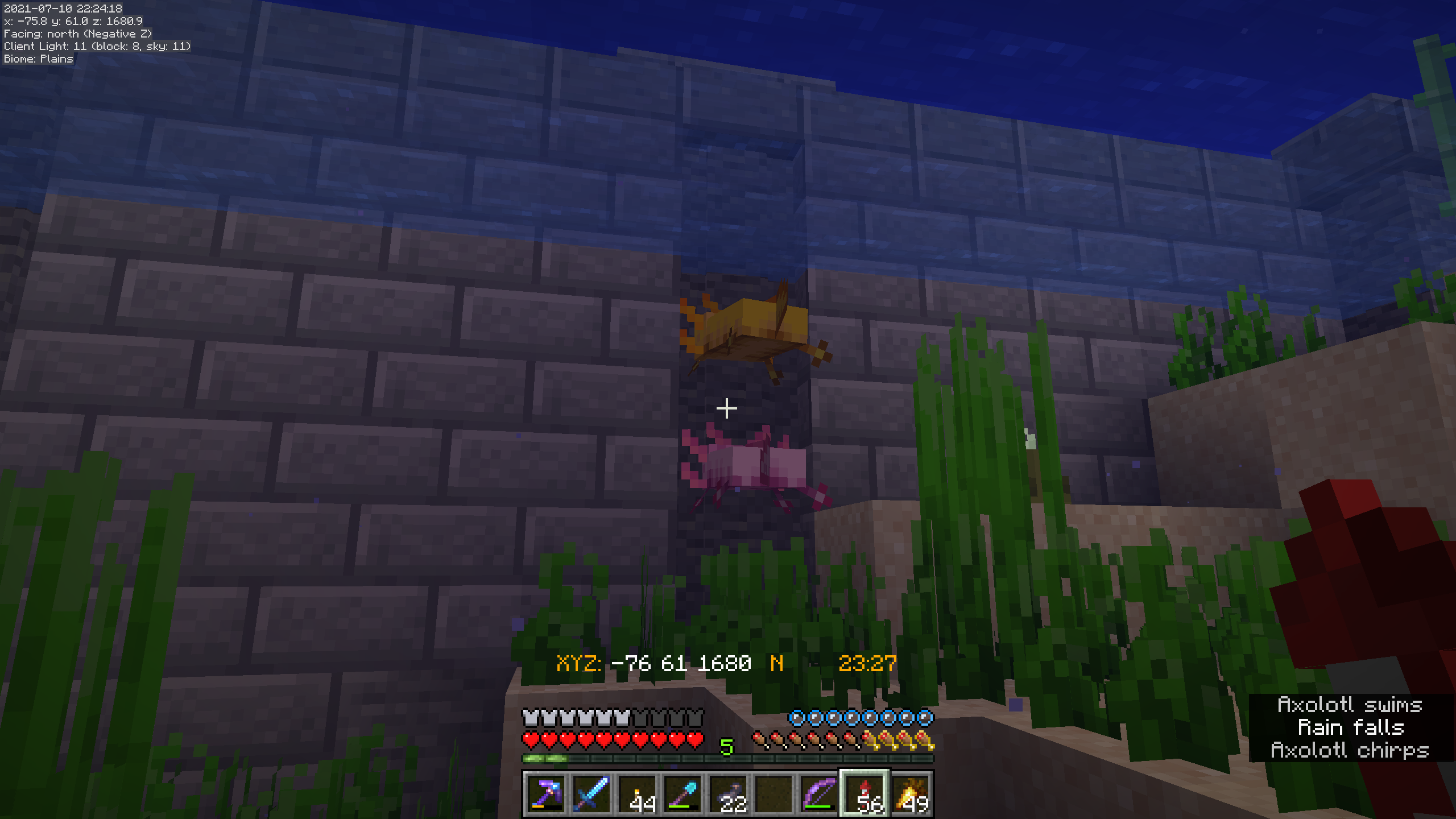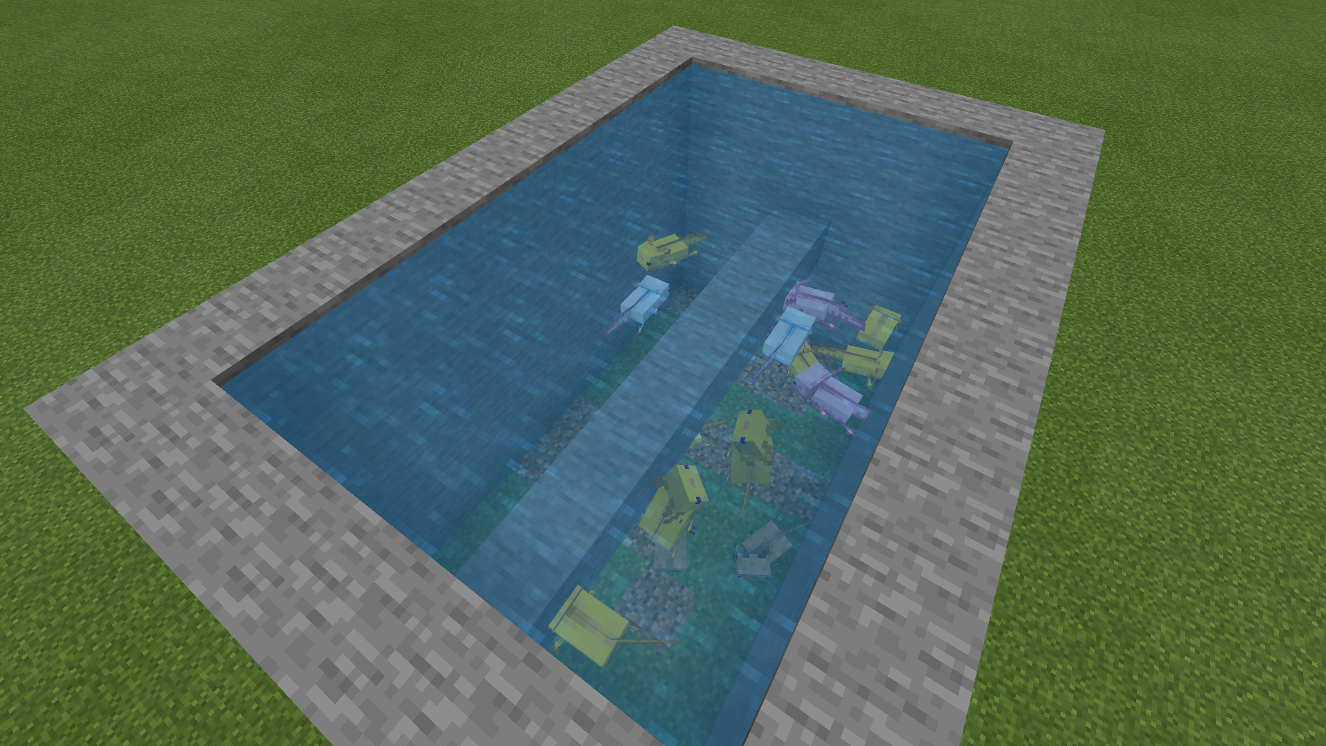Summary: Axolotls, when put into a pool of water with a bar of blocks running through it, tend to get stuck trying to swim through the bar rather than around it.
