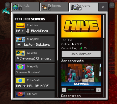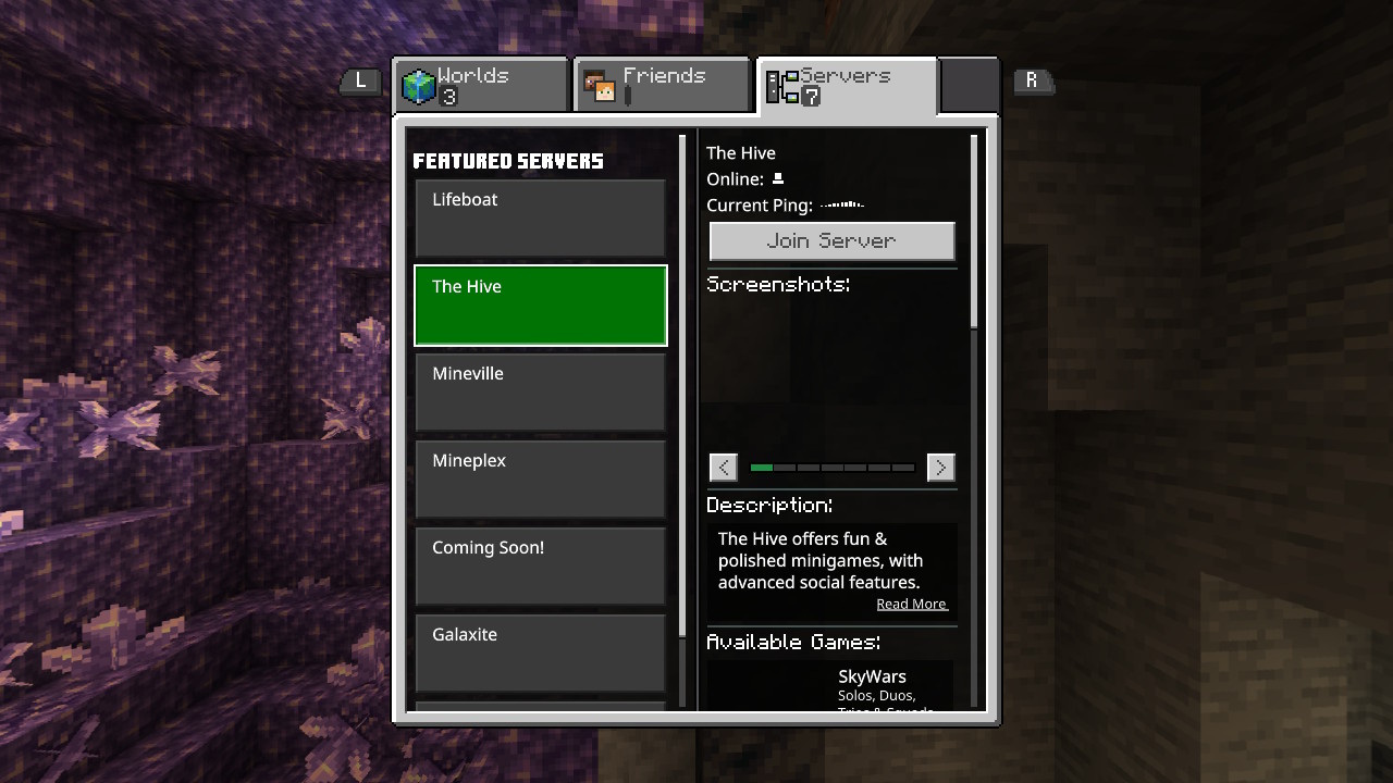 For as long as I can remember, screenshots of any kind have never loaded on the Nintendo Switch version of Minecraft. This affects a lot of things, most importantly, the servers list, the character creator, and the marketplace. This is a big issue, as new players may have trouble finding an item, finding a specific server, or not knowing what a marketplace pack does. All other versions of bedrock don't have this issue except Nintendo Switch. This issue should be fixed before any new UI is implemented into the game.