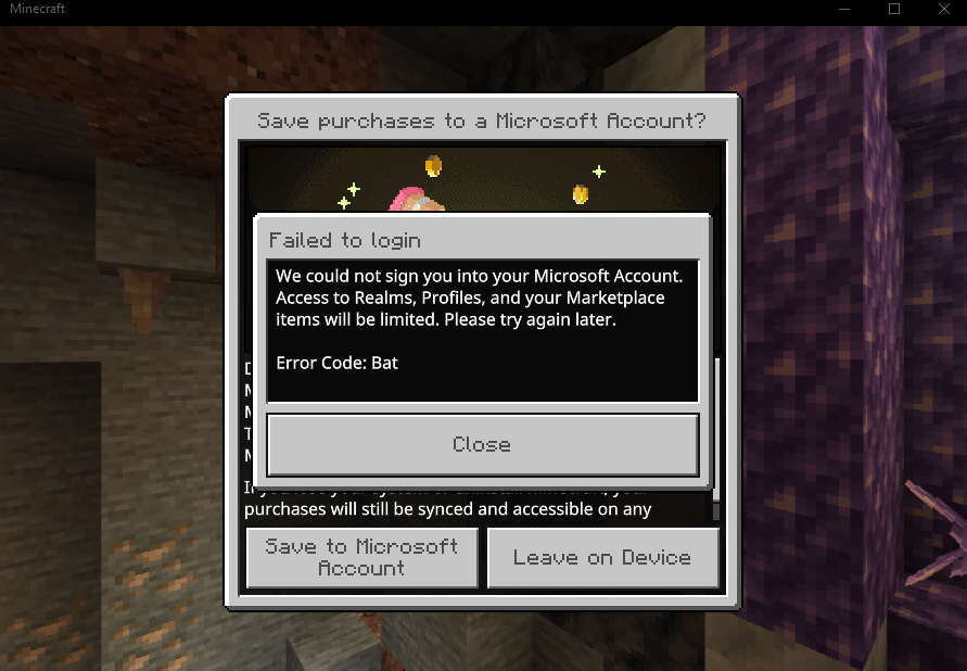 It won't let me login on my pc, I have the bedrock version and every time I try logging in on it asks me if I want my purchases to either be saved on my pc or be save to my account, but no matter which option I pick it fails either way and gives me the Error code: Bat.