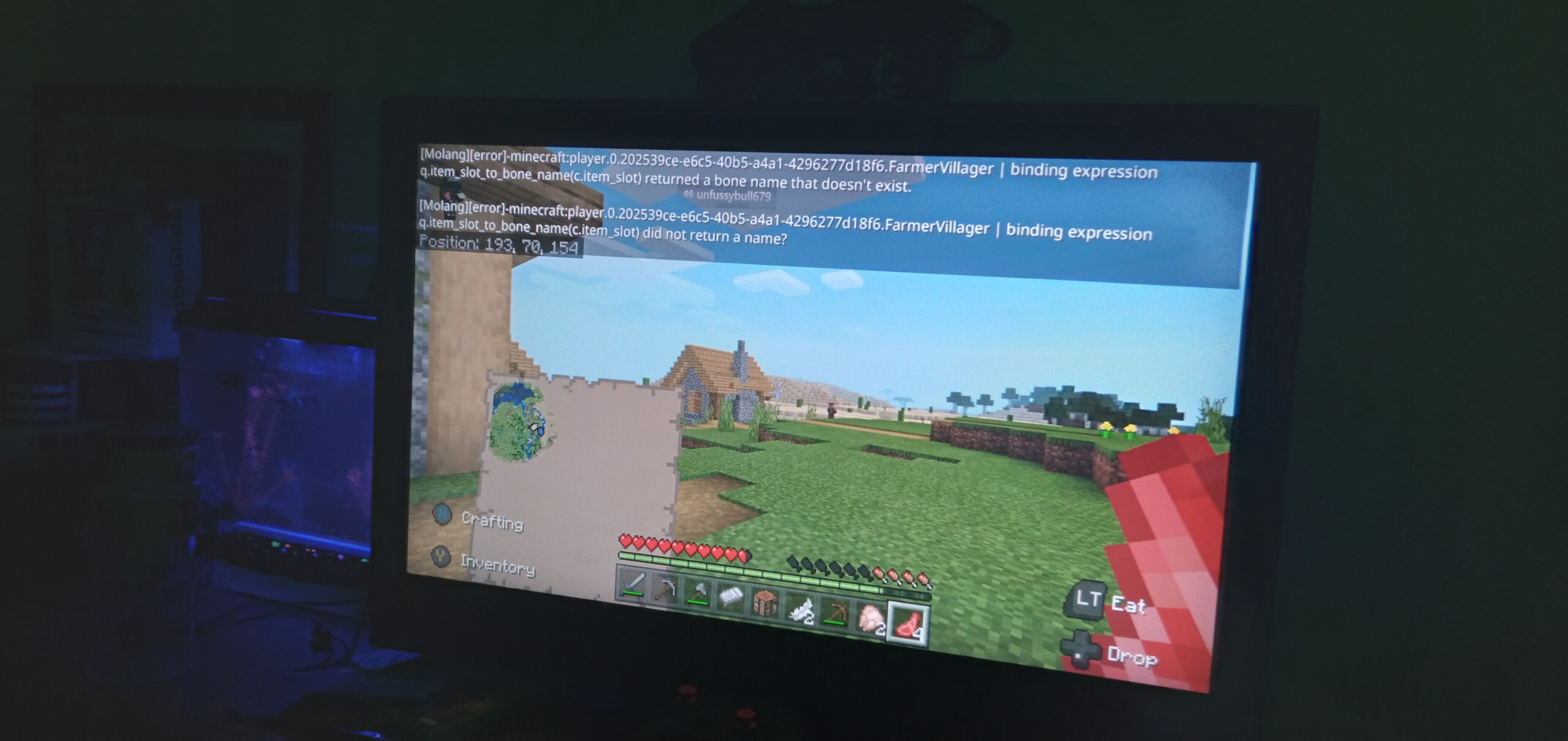 The error keep saying "[Molang][error]-minecraft:player.0.202529ce-e6c5-40b5-a4a1-4296277d18f6.FarmerVillager | binding expression q.item_slot_to_bone_name(c.item_slot) did not return name?" I don't know what it means but I know it's not supposed to say these stuff for no reason I dont see no but or glitch when I play else's it's the villager bugging out but it's fine when I'm looking at him and stuff I dont know if it's the xbox or I might need to reinstall minecraftΒ