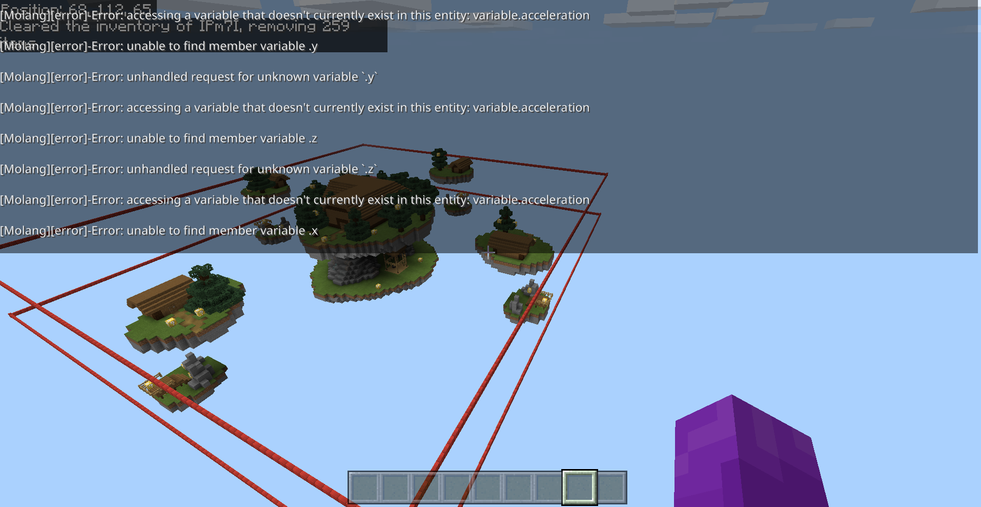 Molang error saying things about acceleration, color, and xyz axes. I have been working on a world for weeks and I recently updated it to 1.17. It was working fine until I tried to get the world onto a different computer and now it won't stop spamming these errors. I found out that it also has to do with particle commands. They all still work, but when I destroy the particle commands, the errors stop. I was able to get the errors to stop by disabling things in the creator settings, but this is going to be a public map download and I don't want people to download is without knowing how to stop it. The errors start when I open the world, but are still there when I close the world, and are still there until minecraft is closed and reopened.