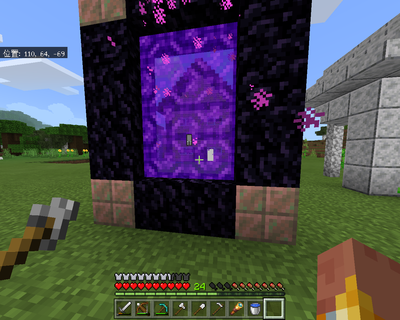 Placed banners are rendered in front of the Nether portal block texture.