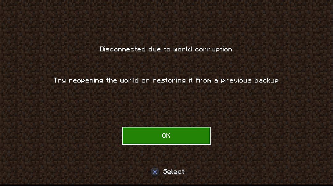 Unable to play game my world opens and i take 1 step and i get kicked out with a 2 errors either world corruption or no storage space i'm really confused about this i only use 1 world