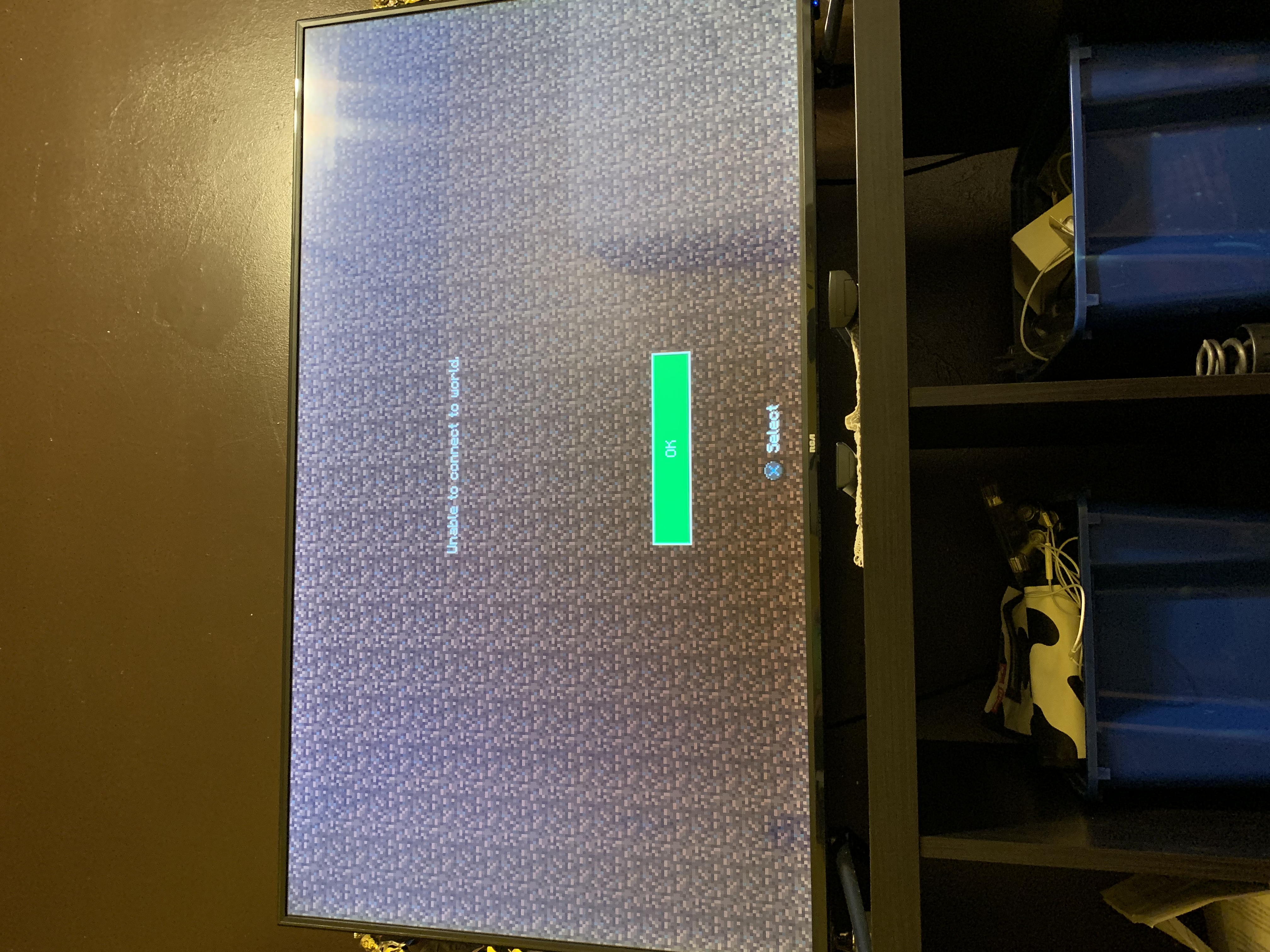 I have noticed progress. Where it says I’m unable to connect to world, when I press “x”, it starts to say generating world and resources but then the same error code comes up. I can not find the exact error but it has to doing something with a long error code that pops up on the top left screen of the main menu.