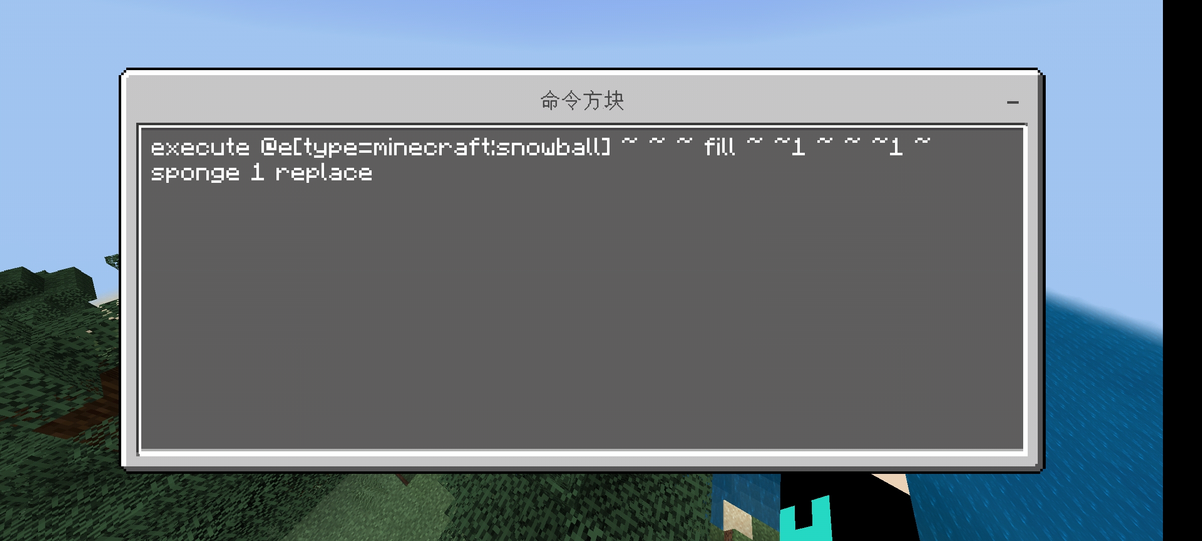 execute @e[type=minecraft:snowball] ~ ~ ~ fill ~ ~ ~ ~ ~ ~ sponge 1 replace
