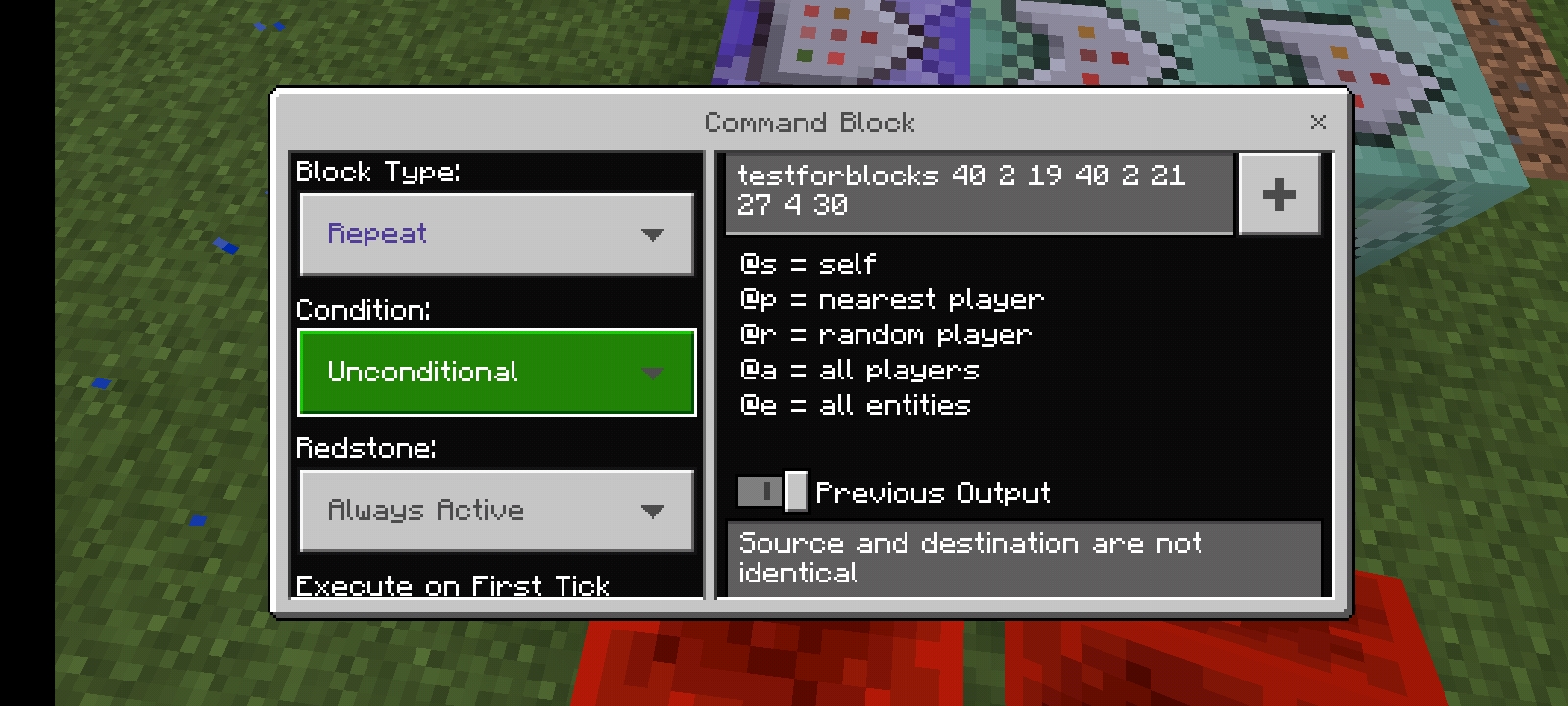 testforblocks 40 2 19 40 2 21 27 4 30(40 2 19~402 21 have redstone block,27 4 30 have redstone block.But it say "Source and destination are not identical",Block Type:Repeat,Condition:Unconditional,Redstone:Always Active)