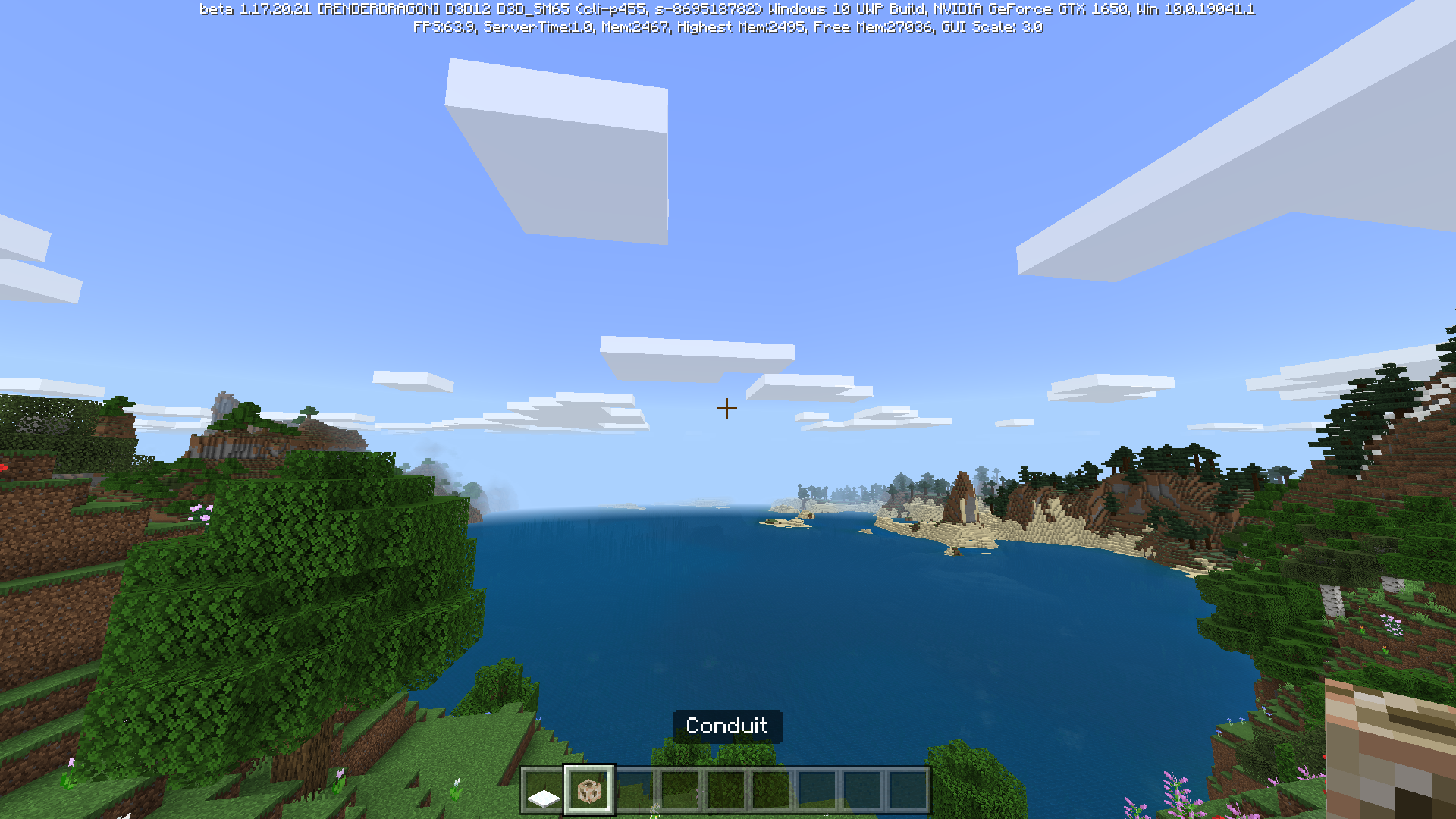 The conduit should be completely visible, and properly held in first person like other blocks on the screen.