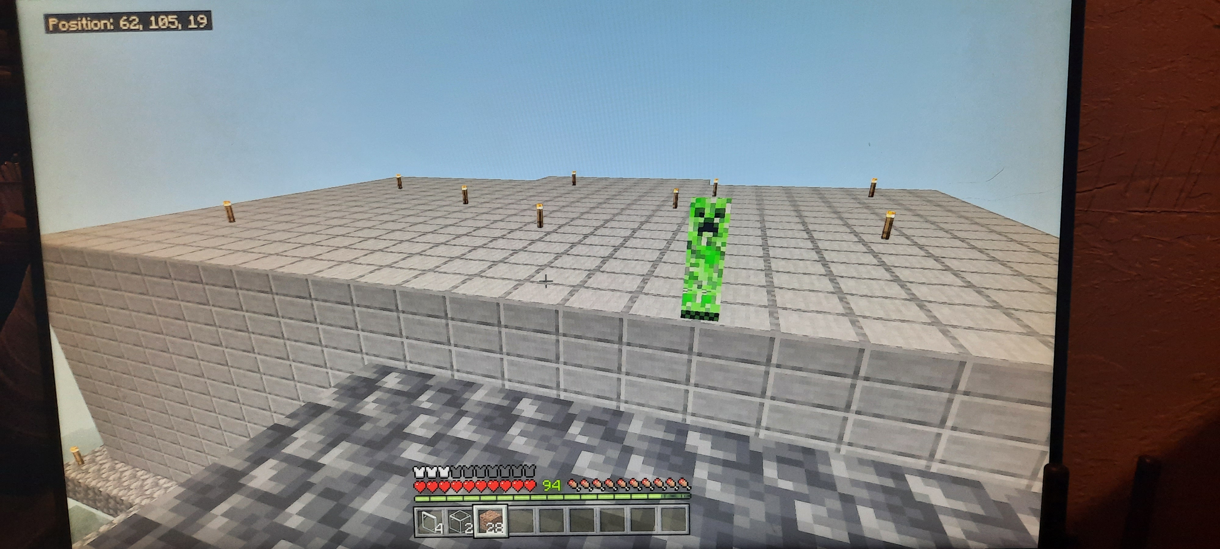 As can be seen in the screenshot, there is sufficient lighting and a creeper standing in that space. There is no way for it to have fell there as the given space is 70-80 blocks off the ground, additionally there are no blocks or anything around the given structure that would enable it to climb up to this location.