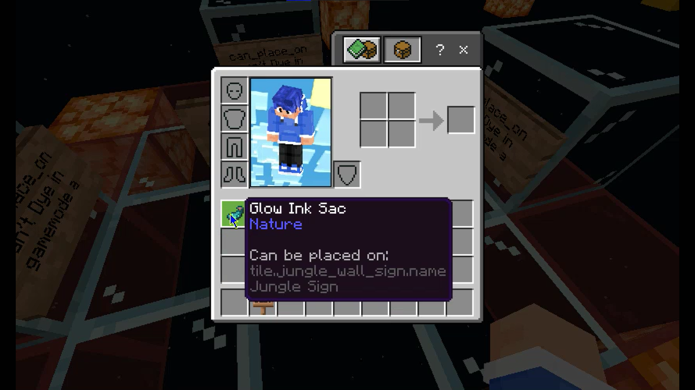 /give @s glow_ink_sac 1 0 {"minecraft:can_place_on":{"blocks":["jungle_standing_sign","jungle_wall_sign"]}}Dyes or (Glow) ink sac in hand then right click to sign