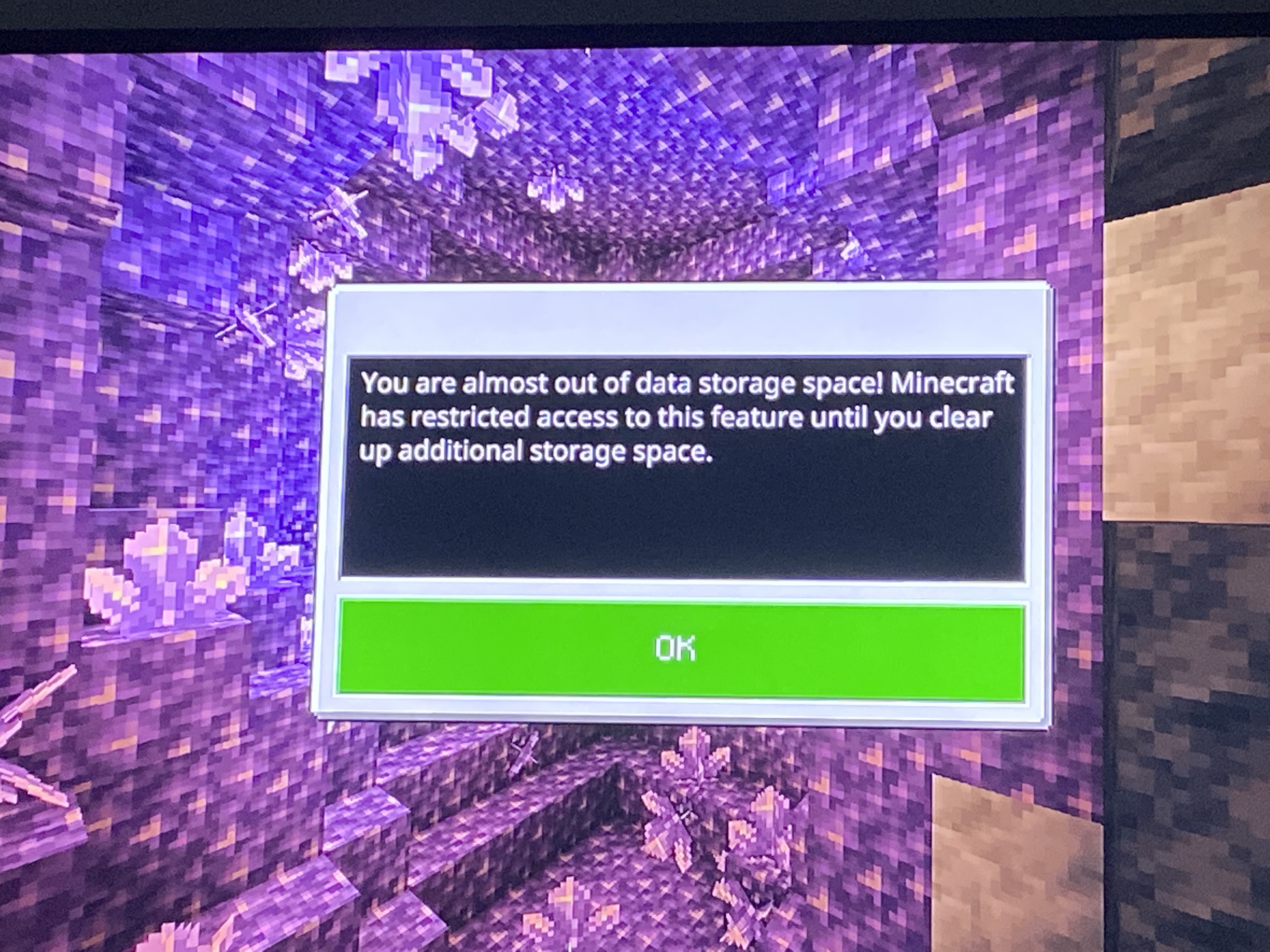 My Nintendo Switch has another 15+ GB left on its internal memory so space isn't an issue in that regard as well as I am able to create new worlds without the storage warning coming up.