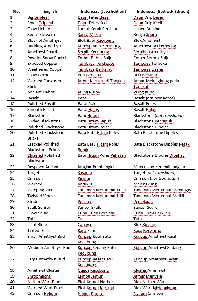 Some of the block, mob, and item names are incorrectly or poorly translated to Bahasa Indonesia on Bedrock Edition. Some of them are only half-translated, or even not translated at all. This is also a disparity issue with Java Edition.