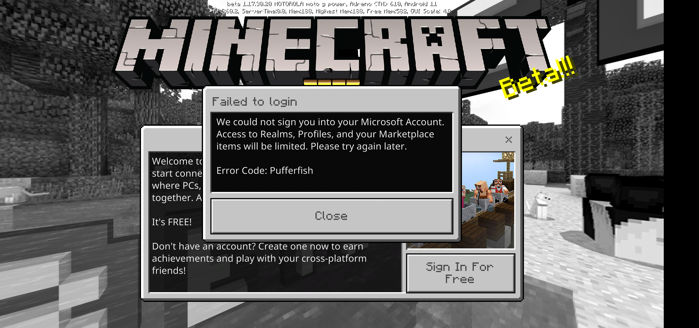 For some reason I can't sign into my Microsoft account on my Android and I'm currently on the beta program and I can't access the world's because they've been deleted and I can't use the main version because the world I want to use had been opened in beta and can't be accessed and it says that the error code is called pufferfish