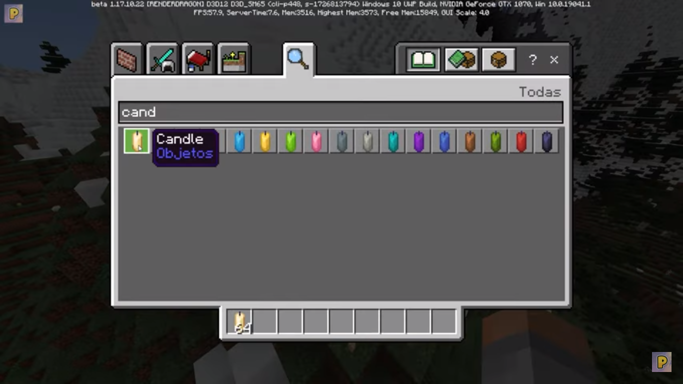 3.- Get candles (either in the creative inventory or craft them with honeycombs and string, you can also get candles you have already crafted)