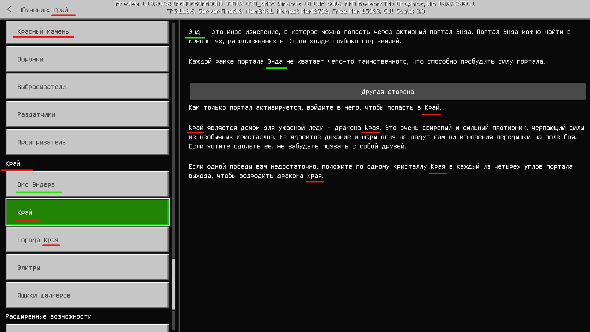For example, in Polish, czerwienitu is replaced by redstone only in the item "Pył redstone". In Polish, only the words "Pył redstone" are correctly translated in the latest versions, the words in which are Nether, Spawn Enderman, Spawn Endermite. In other items (which are mentioned for Russian in the report) there are still problems in Polish.