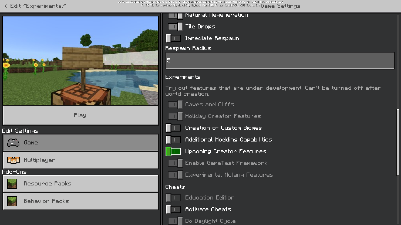 Create new world with Experimental settings on Minecraft version 1.17.30.21,