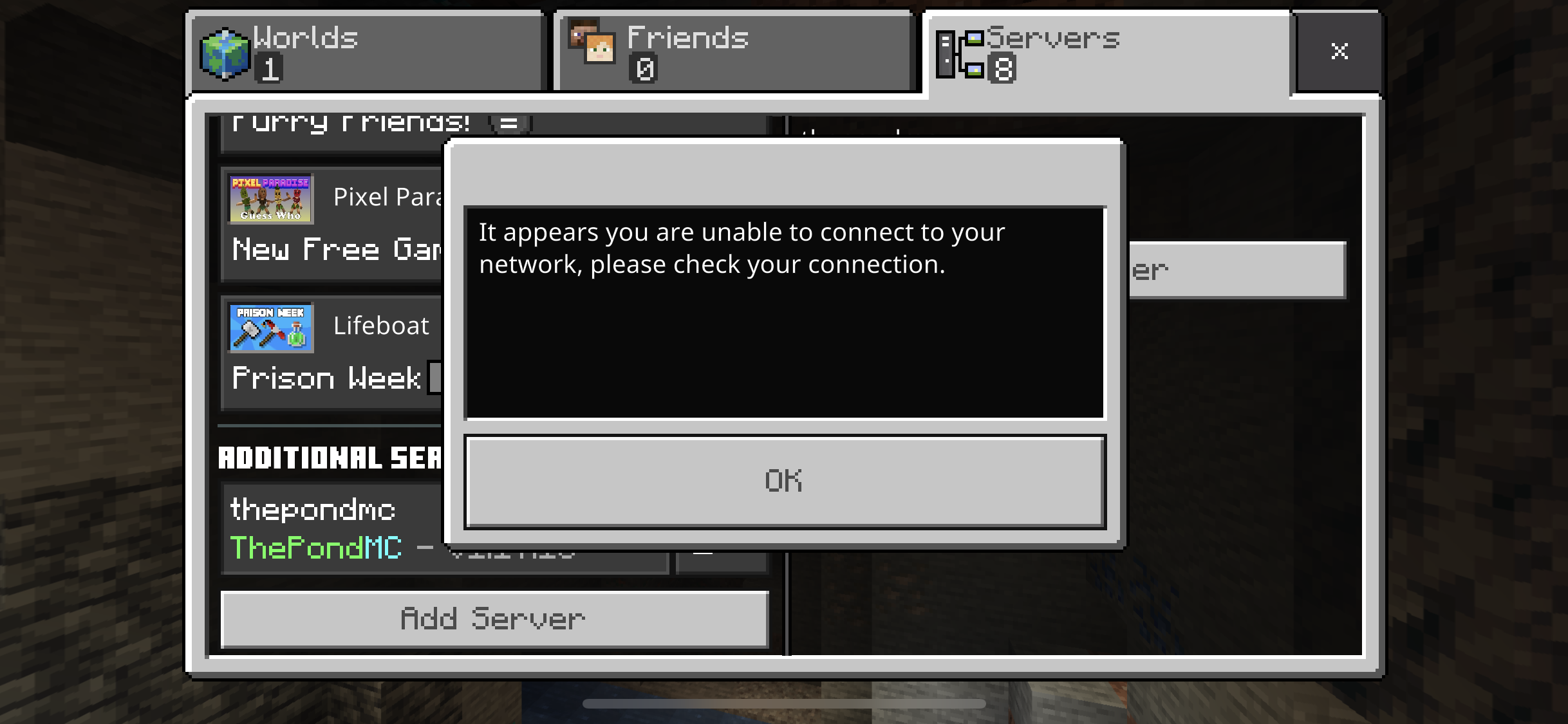 I try to connected various servers, too the main ones but said "it appears you are unable to connect to your network, please check your connection."