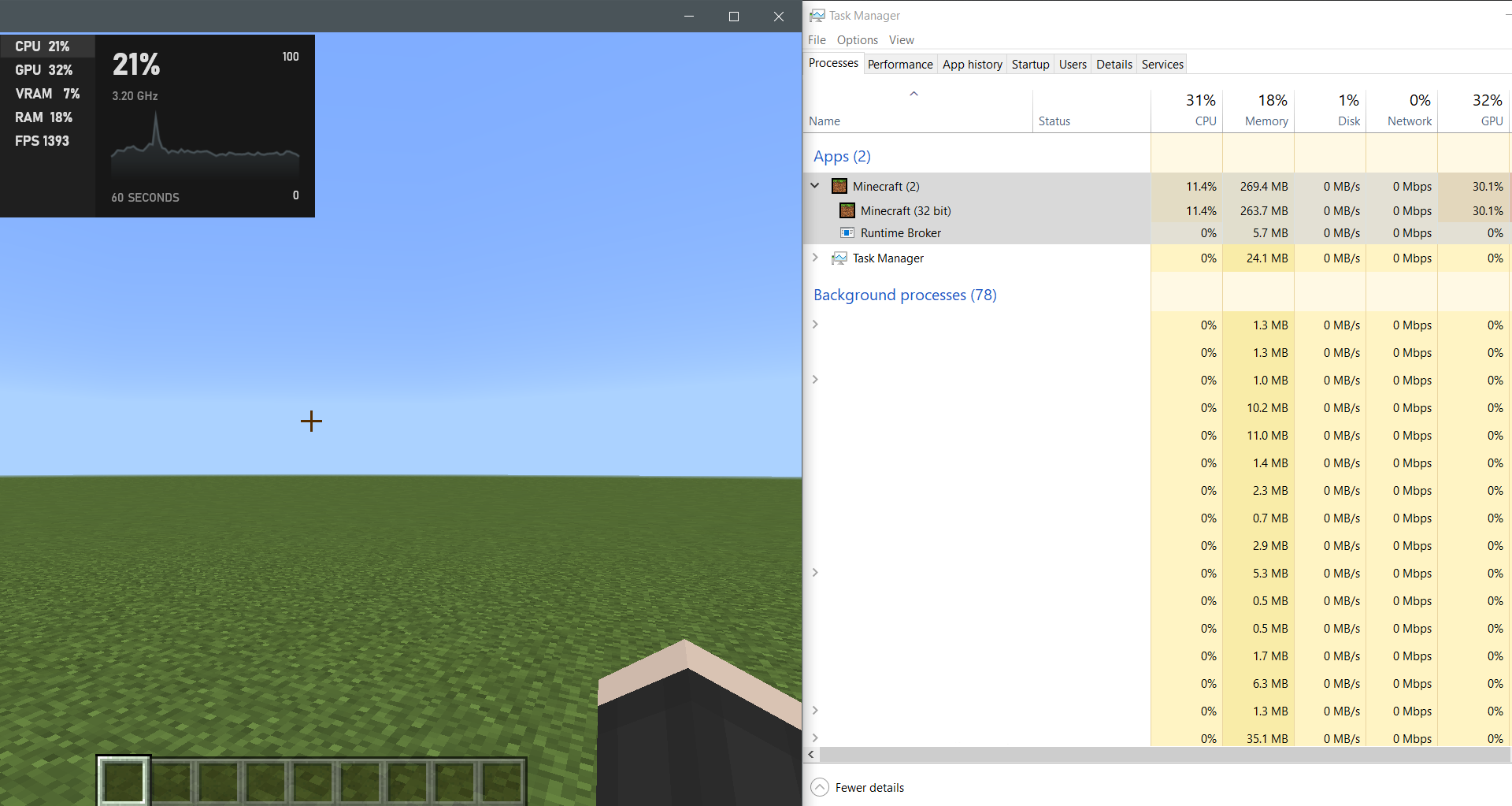 I tried to test both 1.18.12 with two different rendering engines, HAL and Renderdragon, with the same settings and NVIDIA's Ultra Latency Mode on and how many resources were produced by CPU, GPU, and RAM. Here are my results with it.