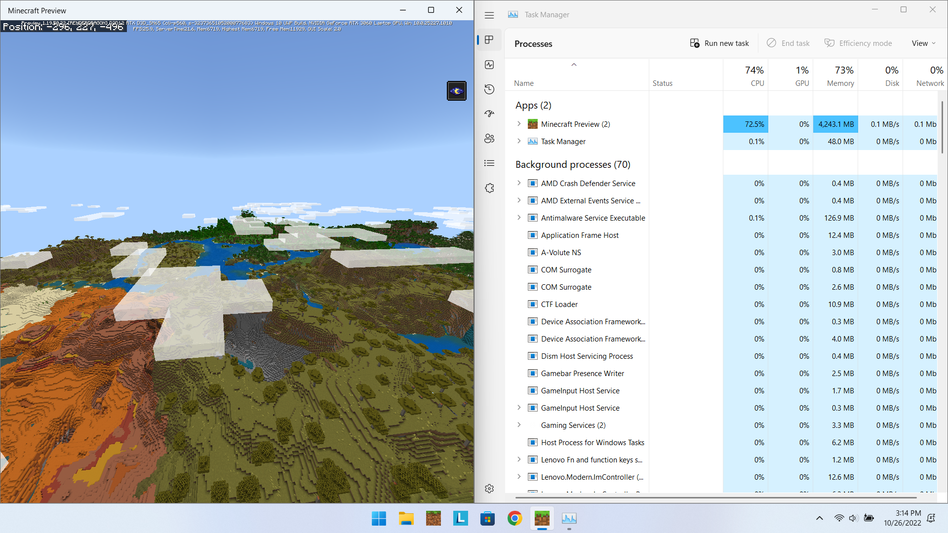 The graphical settings I had on for this test were 10 chunk render distance, all anti aliasing off/all the way down, smooth lighting, and fancy graphics on. I am running windows 10 build 19044 and a dx12 capable device