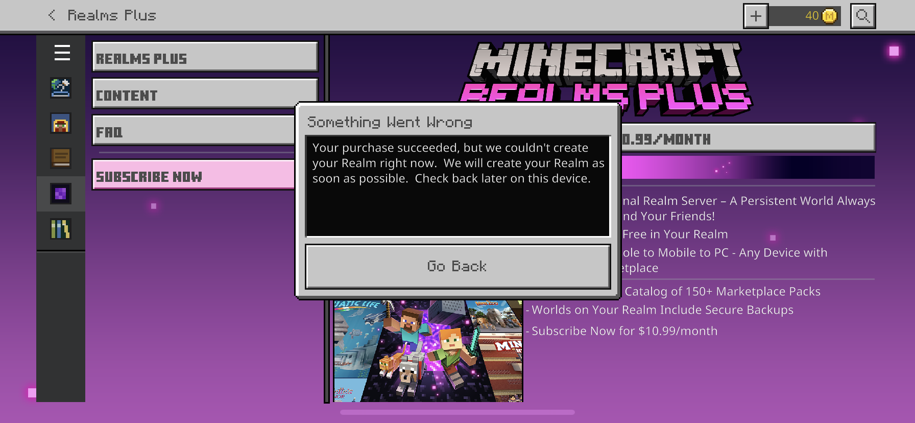 I renewed my realms subscription about two days ago and when i tried to create a world it would give me a thing saying " something went wrong" then bottom text saying "your purchase was succeed but we couldn't create your realm right now. we will create your realm as soon as possible. check back later on this device" so i waited all day yesterday and when i tried again today it didn't work again and gave me that same error. The 12.45 that is for the realms subscription was already taken from my account, i want to be able to create my realm or get my money back and im not sure who to contact for this