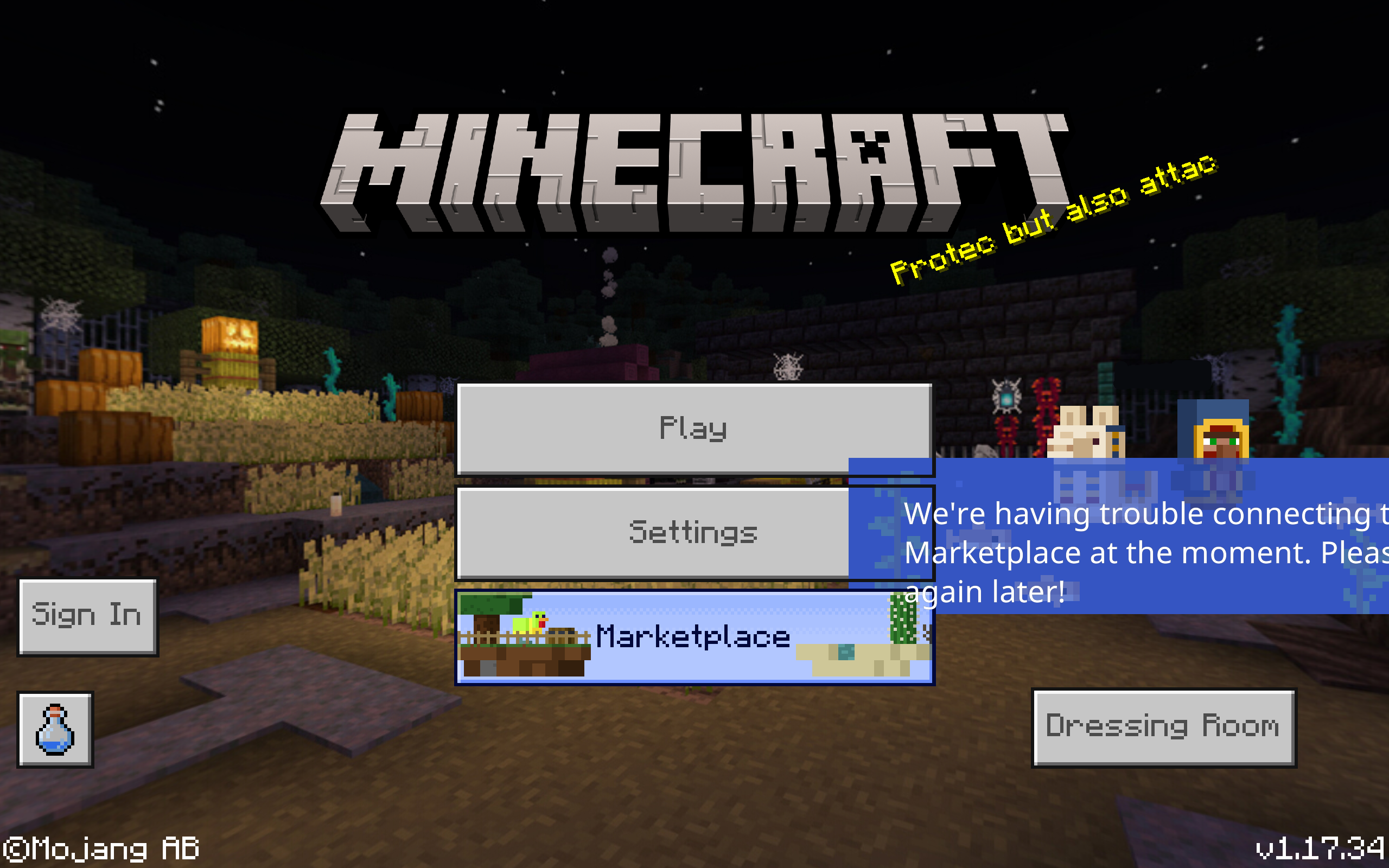 This was not a very big issue before 1.17.34, because before this update the imported skin would show an infinite loading icon on the title screen, which is small and doesn't affect gameplay. However, after 1.17.34, a huge "cannot connect to market place" sign would appear, blocking up a huge part of the screen. However, this ticket is not about the huge sign, I'm just mentioning how this bug became annoying.