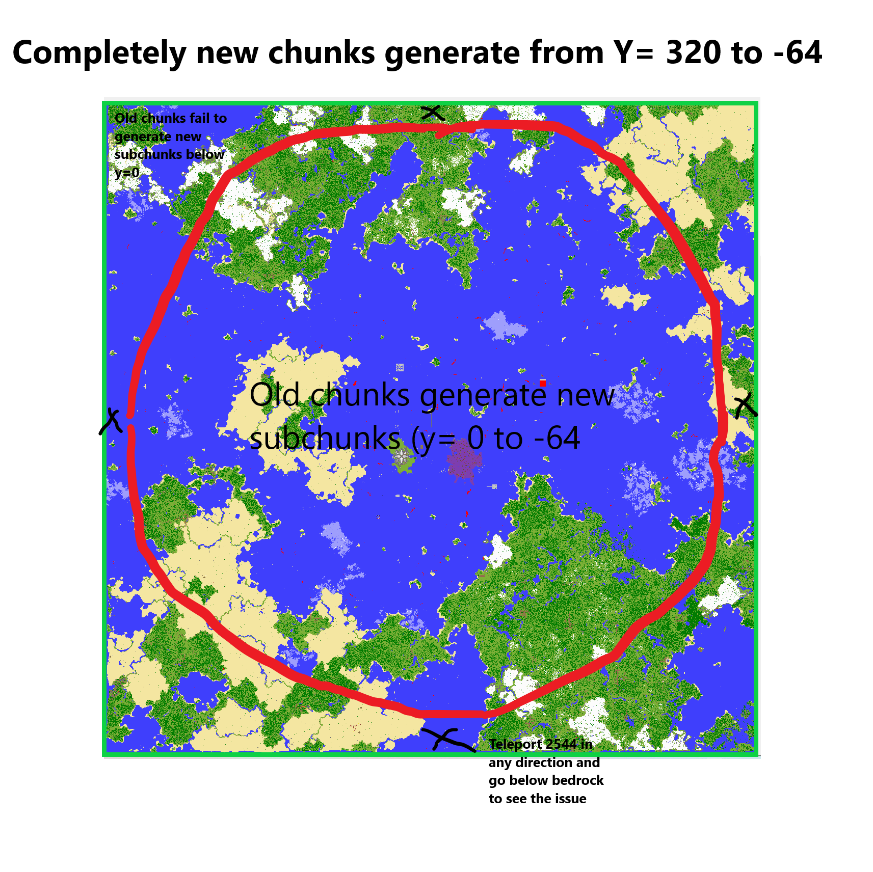 Also teleporting to 0, y, 0 and walking below bedrock shows that subchunks generate below y=0 correctly until you reach to about the red circle represented in the map below.