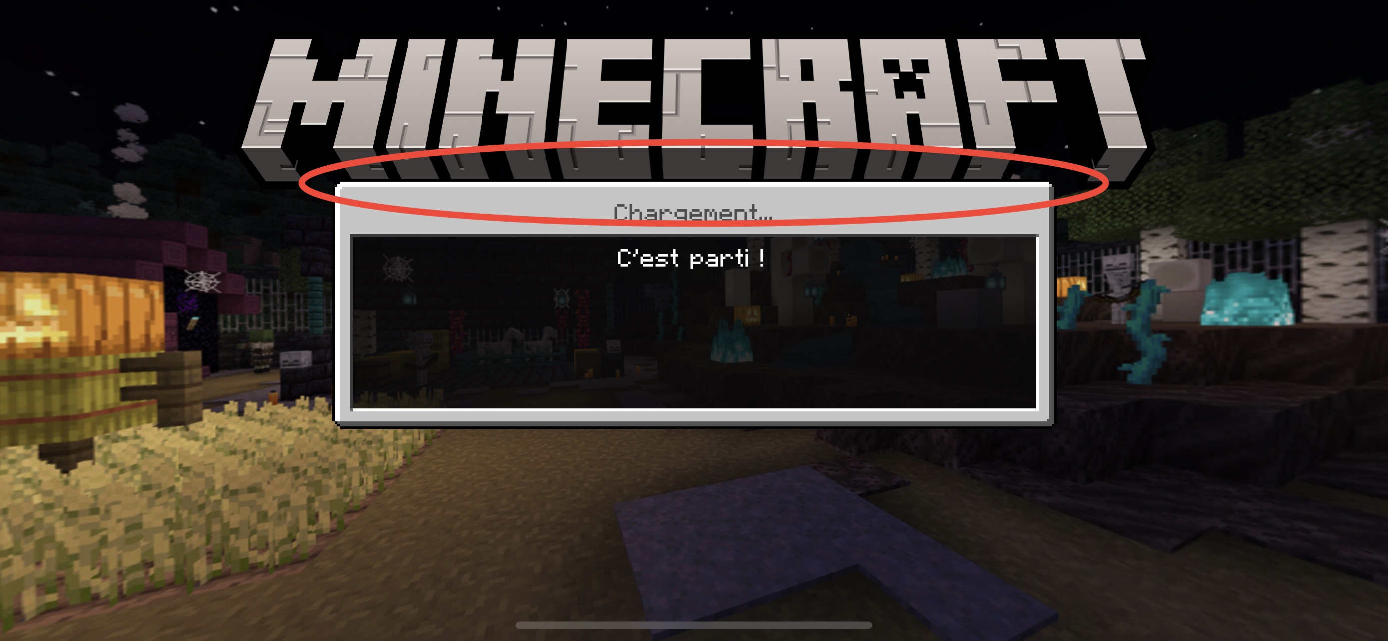 The world loading screen protrudes over the Minecraft logo.