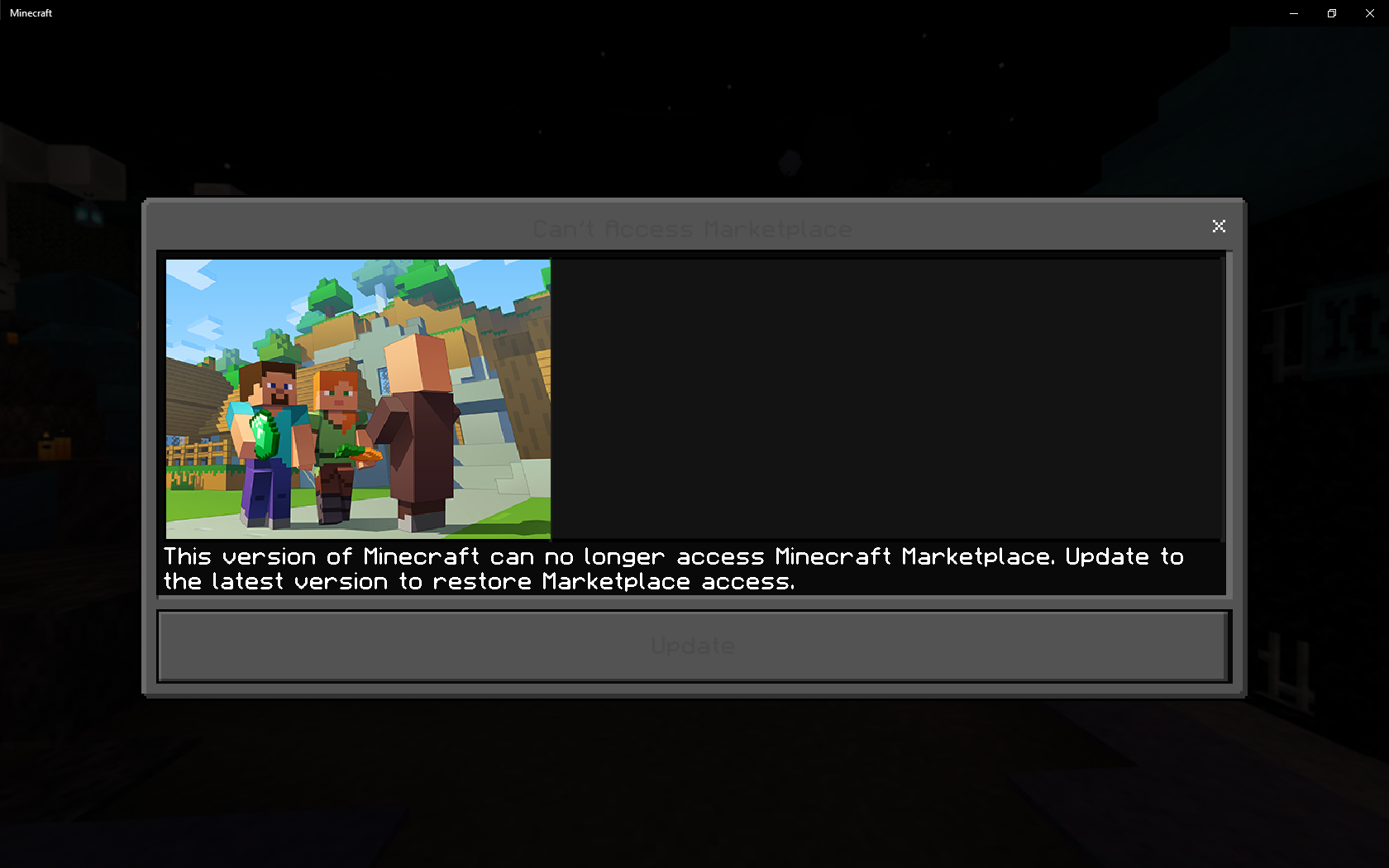 After selecting a custom skin offline, an error message comes up saying, "This version of Minecaft can't connect to the market place.