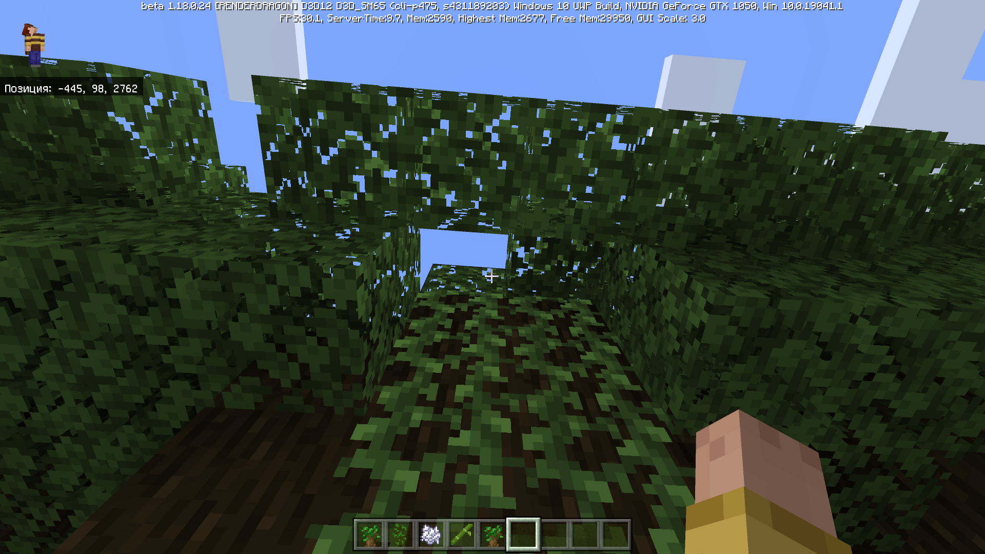 Vines on a dark oak sometimes replace blocks of leaves with vines, thus forming holes through the trees. This happens both when generating and growing trees from saplings. This bug occurs only with dark oak.