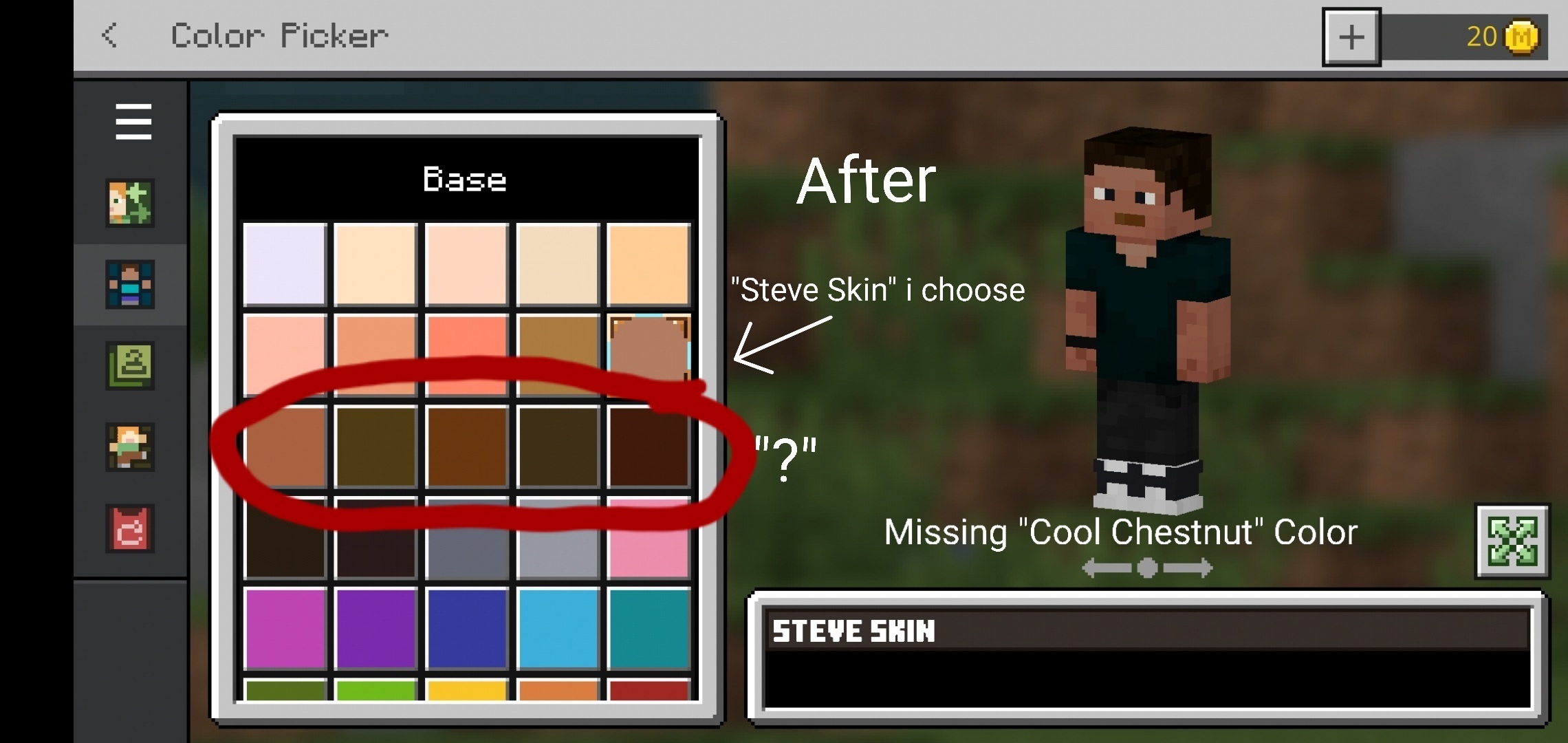 In 1.17.41, Missing skin color is like "Cool Chestnut"? I think, From Before is normal skin what I equip my skin Color and after is missing Color. Take a look at pictures.