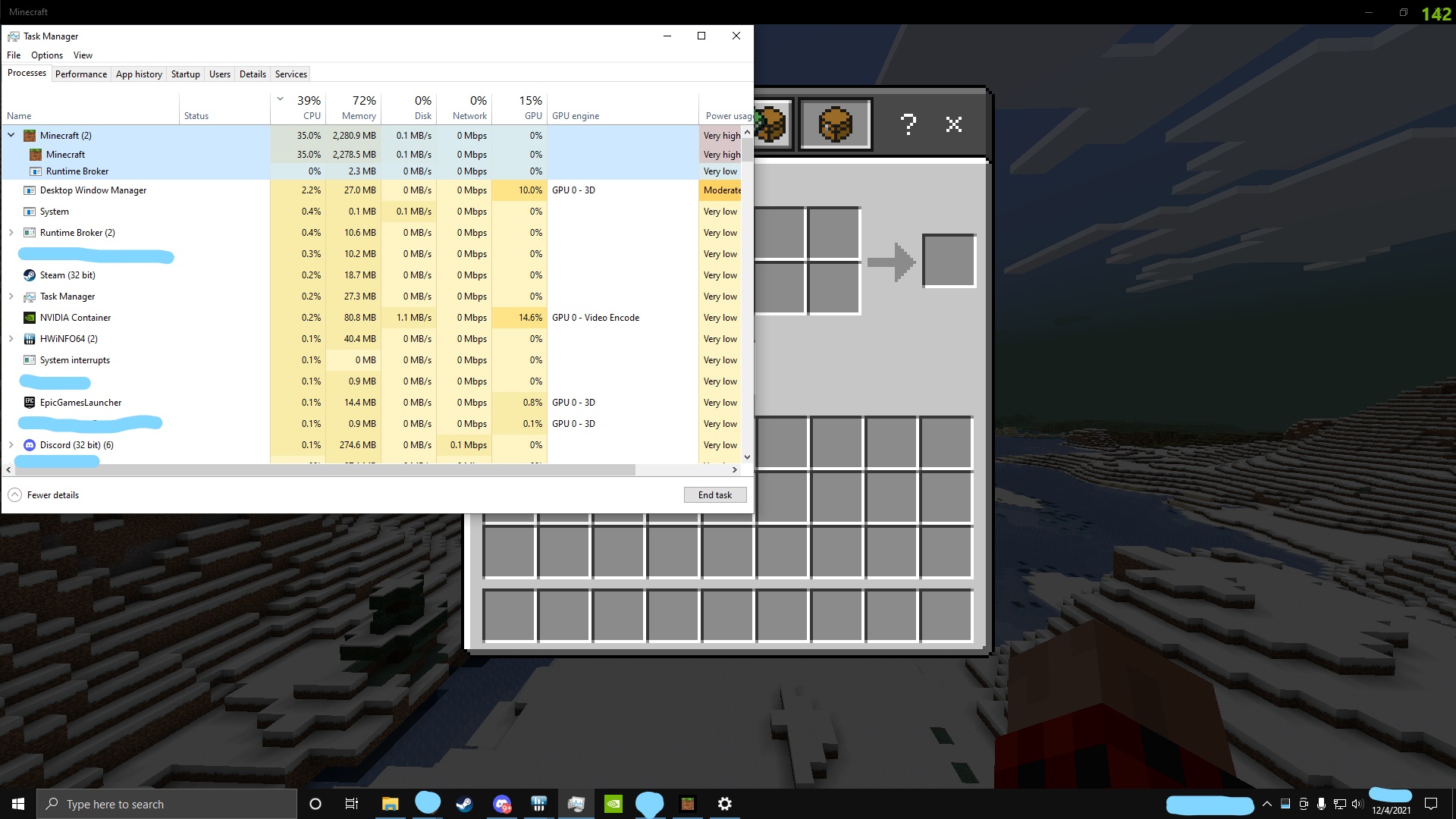 When Playing Minecraft, task manager reports that the GPU utilization for the game is at 0%.  I wouldn't really care as long as I could still have a high render distance, but if I go past a 24 chunk render distance, FPS drops severely.  This problem has not affected any other games that I've played.  I have tried setting the graphics settings for Minecraft to High Performance in the windows settings with no differences in utilization.