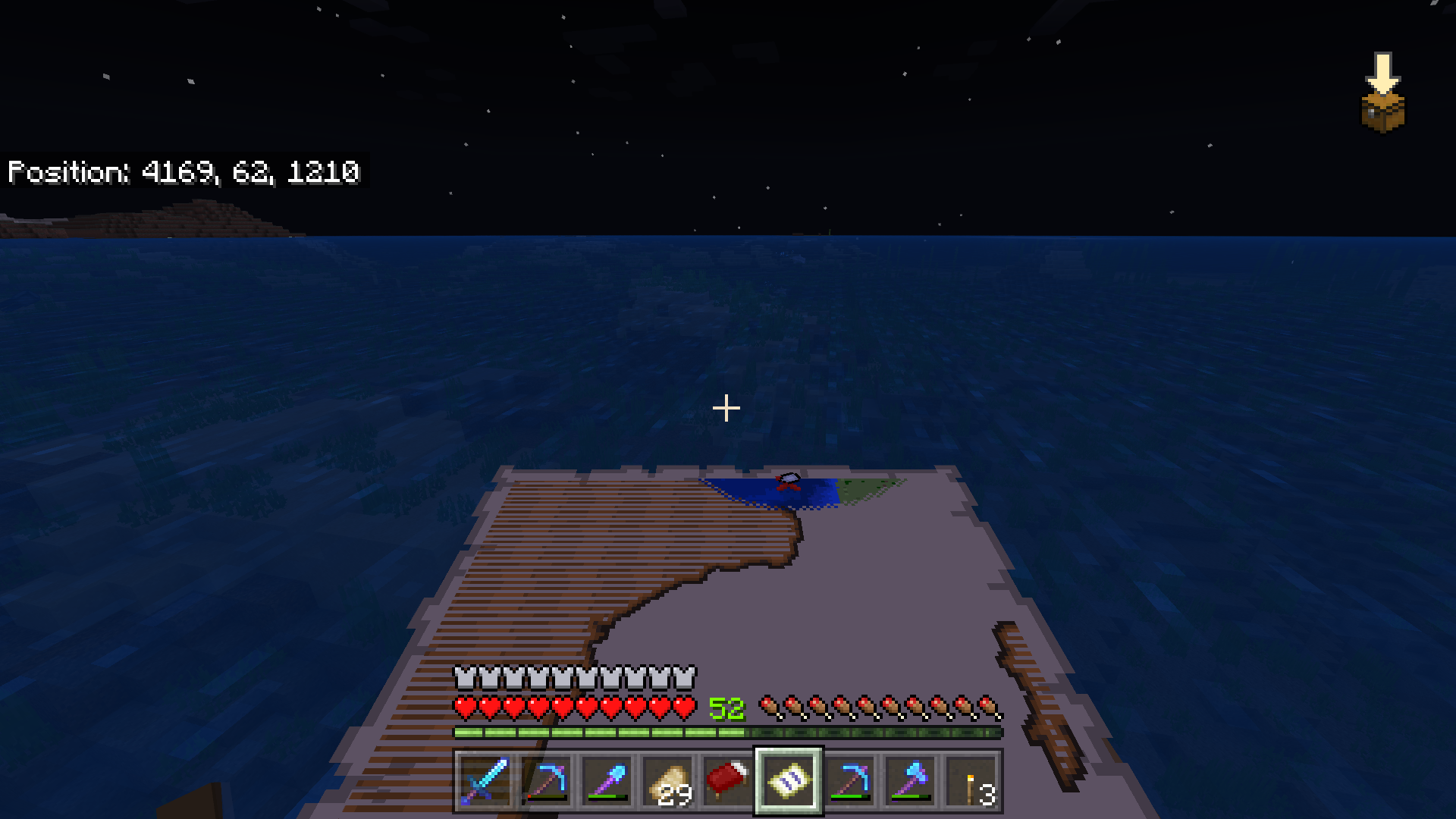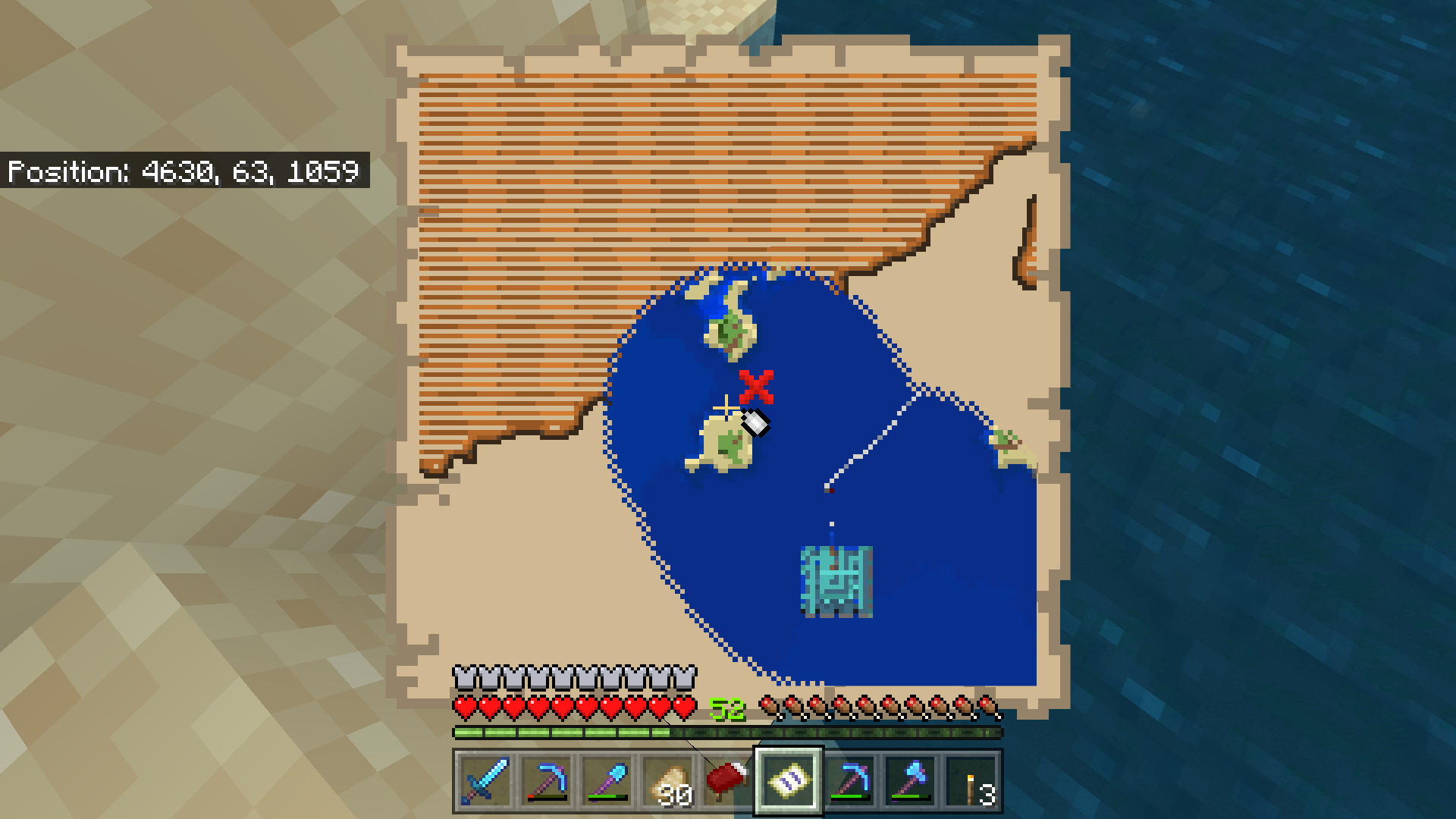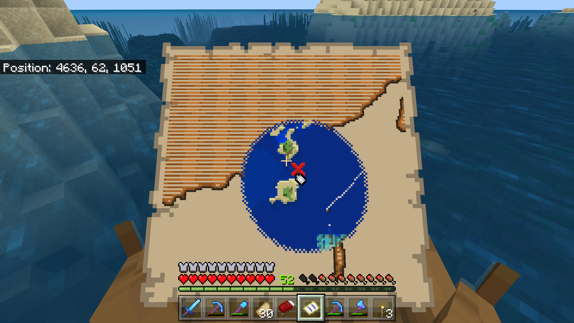 Did find 3 old chunk treasure maps, from the old underwater ruins, located down where the marker in first screenshot is pointing at. All 3 maps were exact duplicate of the first one, the one shown in the screenshot - they all were showing outline of the new chunk terrain, despite it's old chunks and as such looks completely different. And also the marked treasure location is exact same for all of them. Exact same map that led me there x3, but for some reason unearthed from old chunks. Needless to say, there is no treasure underneath the ocean.