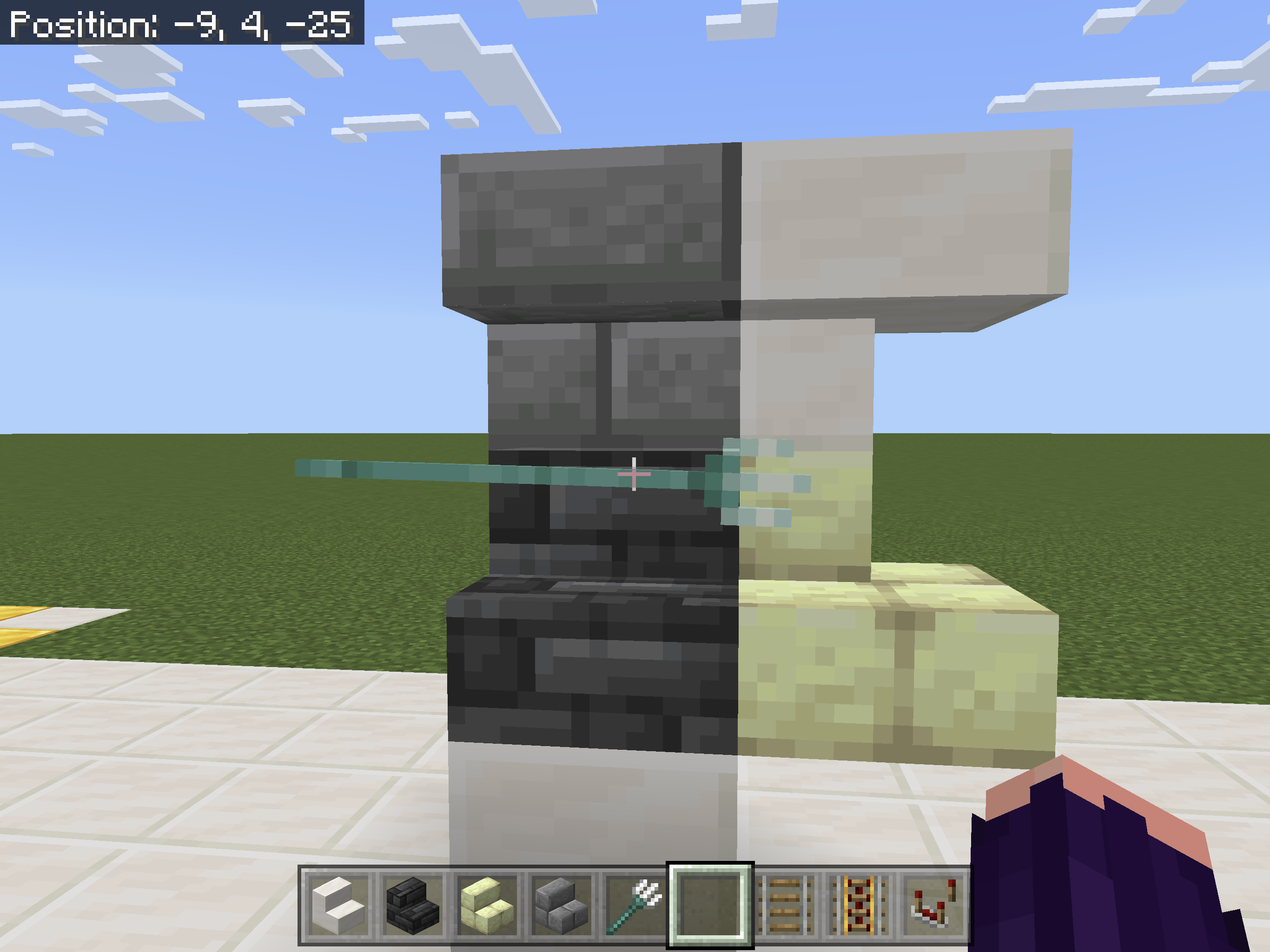 2, Place another stair block in front of that block at 90 degrees on the x axis, the front stair block will morph/connect with the rear block in a way that cuts off half of the top portion of the stair block so you can still see through the gap in the rear stair, you can’t shoot through this gap now, the arrow or trident just hits the gap and stops