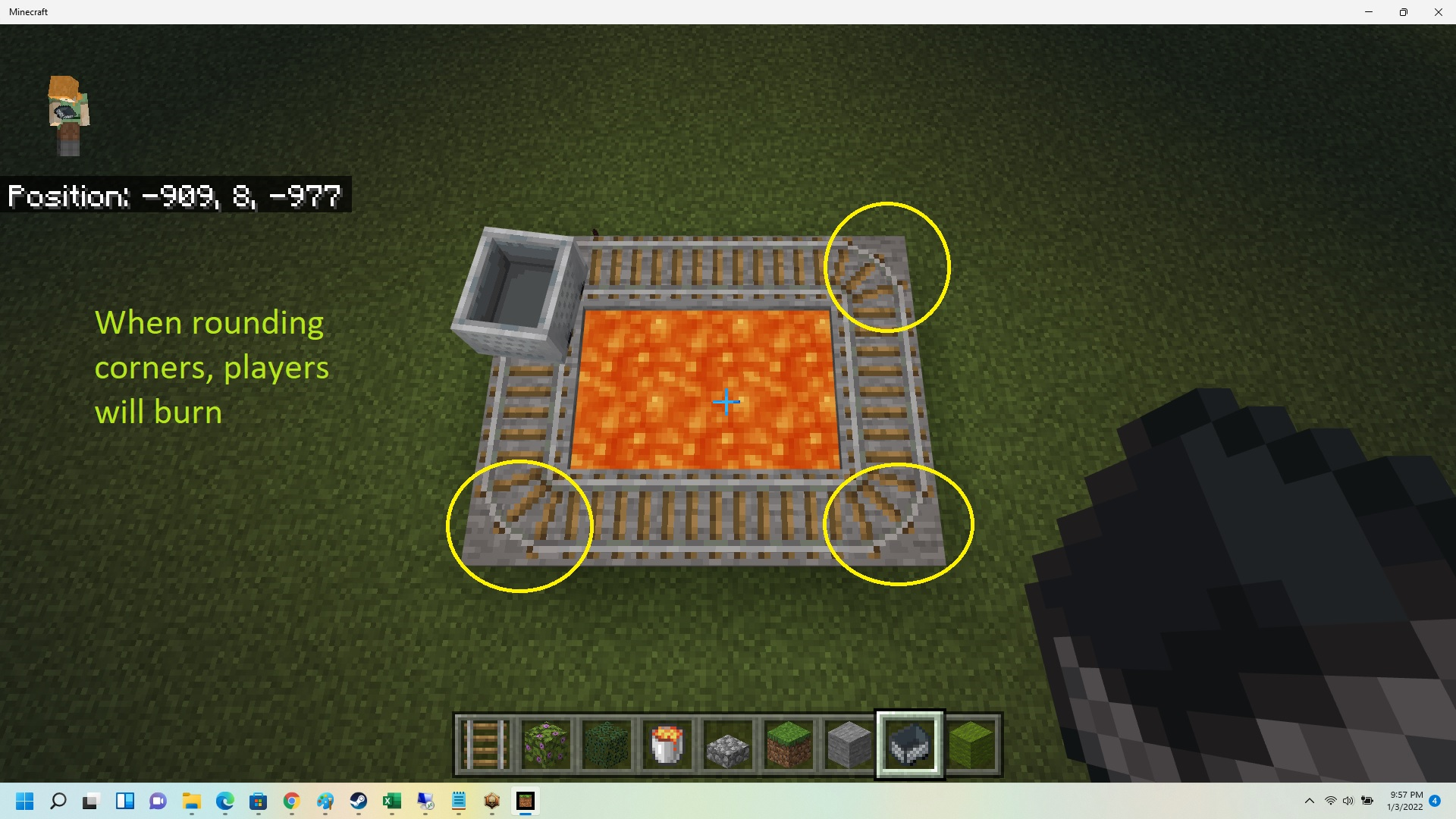 Players burn when rounding corners while in a minecart traversing block-supported tracks adjacent to lava. It doesn't matter what block the rail is built on, players still burn, but only when making turns. See IMAGE for example of this bug, hopefully it will be clear.