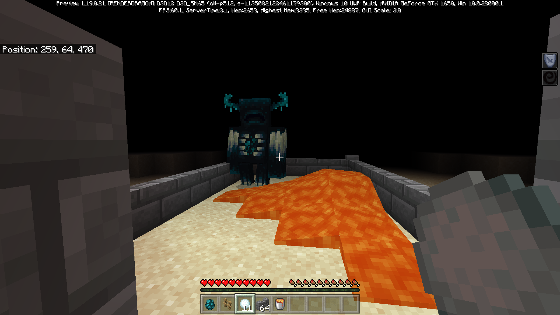 The Warden, despite being immune to lava, cannot pathfind through lava when chasing the target. This is inconsistent with other mobs that are immune to lava, which will attempt to walk through it to get to the player if there is no other option. This may lead to more cheesable situations for the Warden in the Deep Dark.