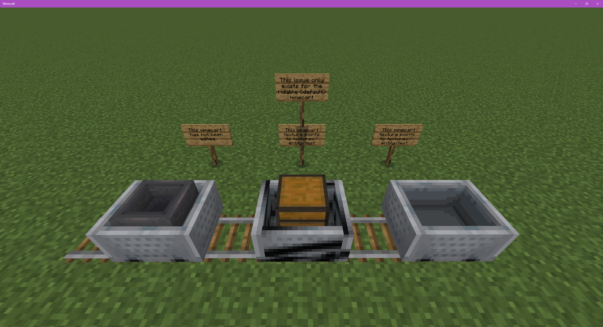 In the example world attached both the chest minecart and the vanilla minecart have the texture pointing to "textures/entity/test" yet only with the chest minecart is a change visible.