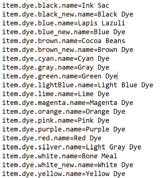 The names of white, black, blue, and brown dye are mislabeled as Bone Meal, Ink Sac, Lapis lazuli, and Cocoa Beans, respectively. The original items are still present. I have no resource packs and my language is set to English (United States). It appears that the name of each dye has been recently reverted in the language files.