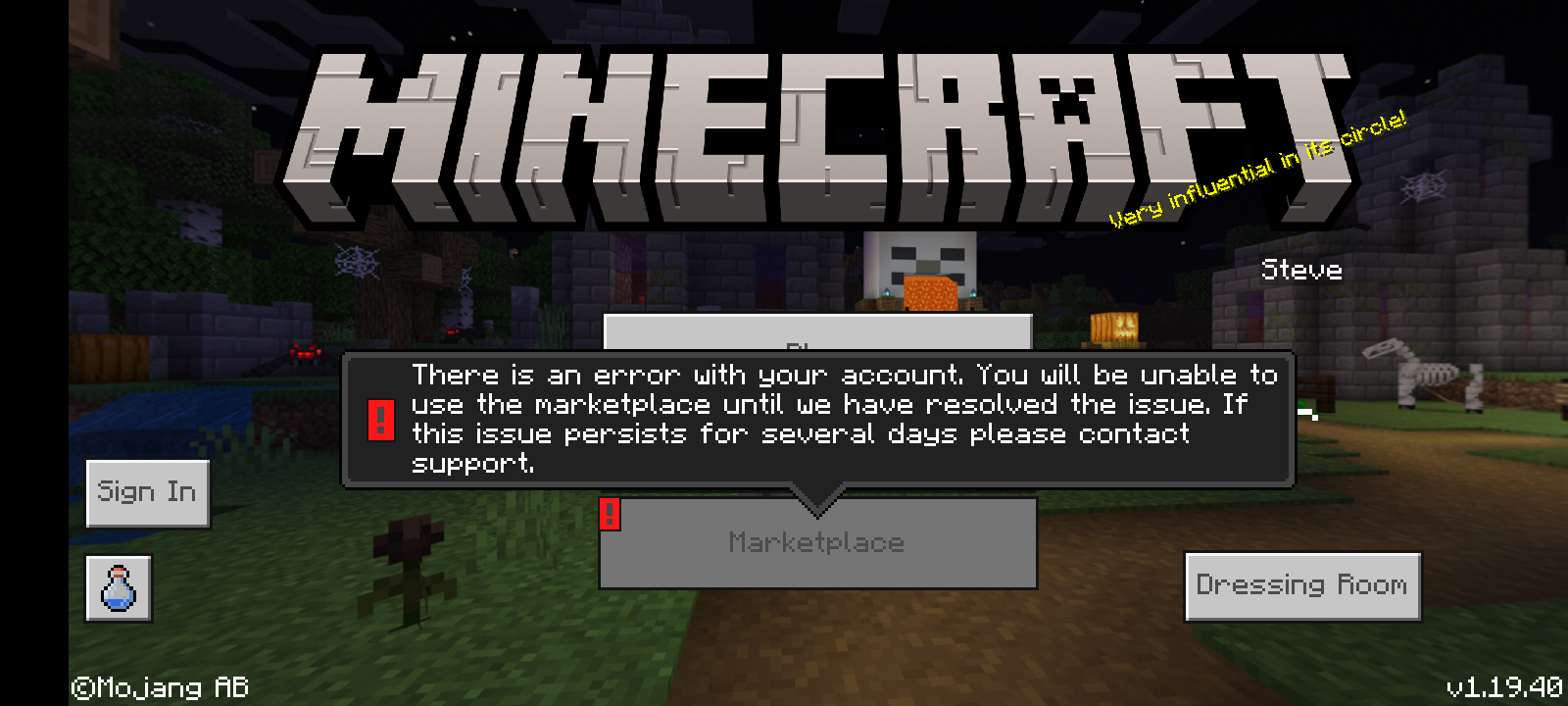 I've tried restarting, reinstalling, clearing cache, swapping to mobile and back, so far nothing. I can access servers just fine, yet I am unable to access the marketplace or the skin editor. Curiously, the marketplace loses the error notice on the home page after loading into a world and back out, but clicking on it does nothing, and the marketplace in-world remains errored out.
