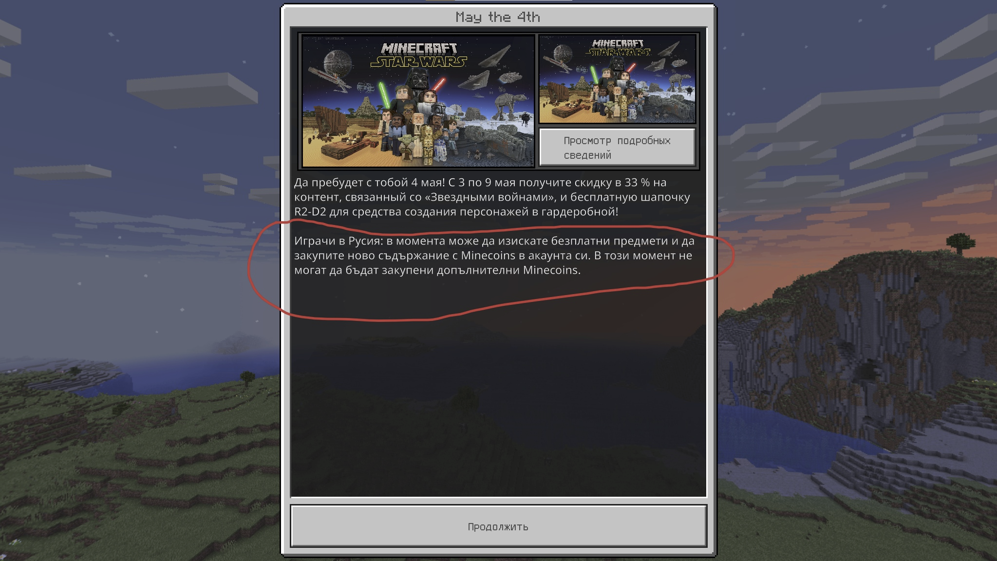 The circled half of the text is in Bulgarian and it says: "For players in Russia: You may currently request free items and purchase new content with Minecoins with your account. Currently, you can't buy new Minecoins. "