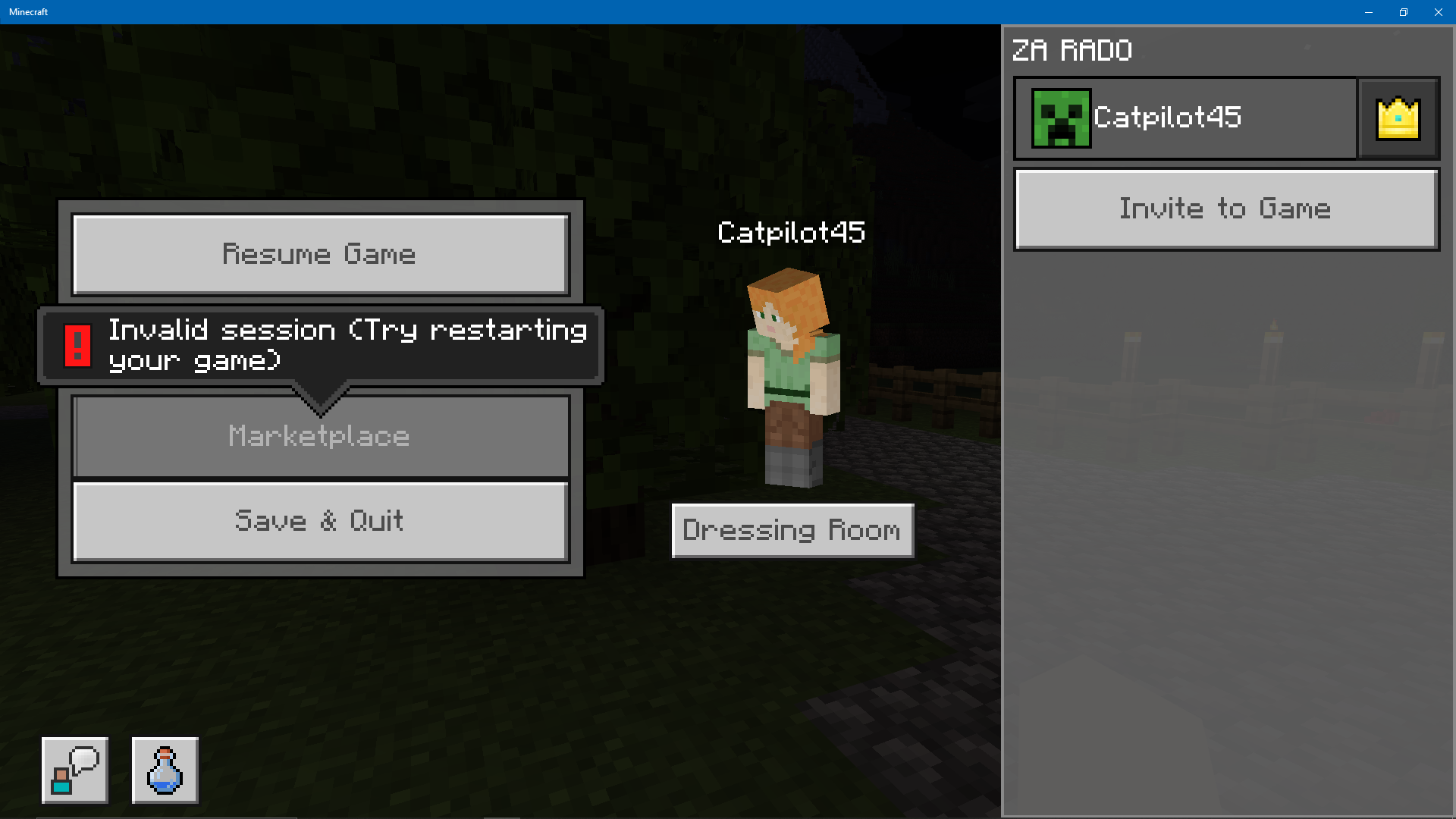 I started having the bug that the Dressing Room won't load and I cannot access my skins. I also cannot access Marketplace. When I play in a world and try to access Marketplace, it says "Invalid Session". I have restarted Minecraft several times, restarted my computer, and uninstalled and reinstalled Minecraft. None of it worked and I still have the same issue. Please help me at your earliest convenience.