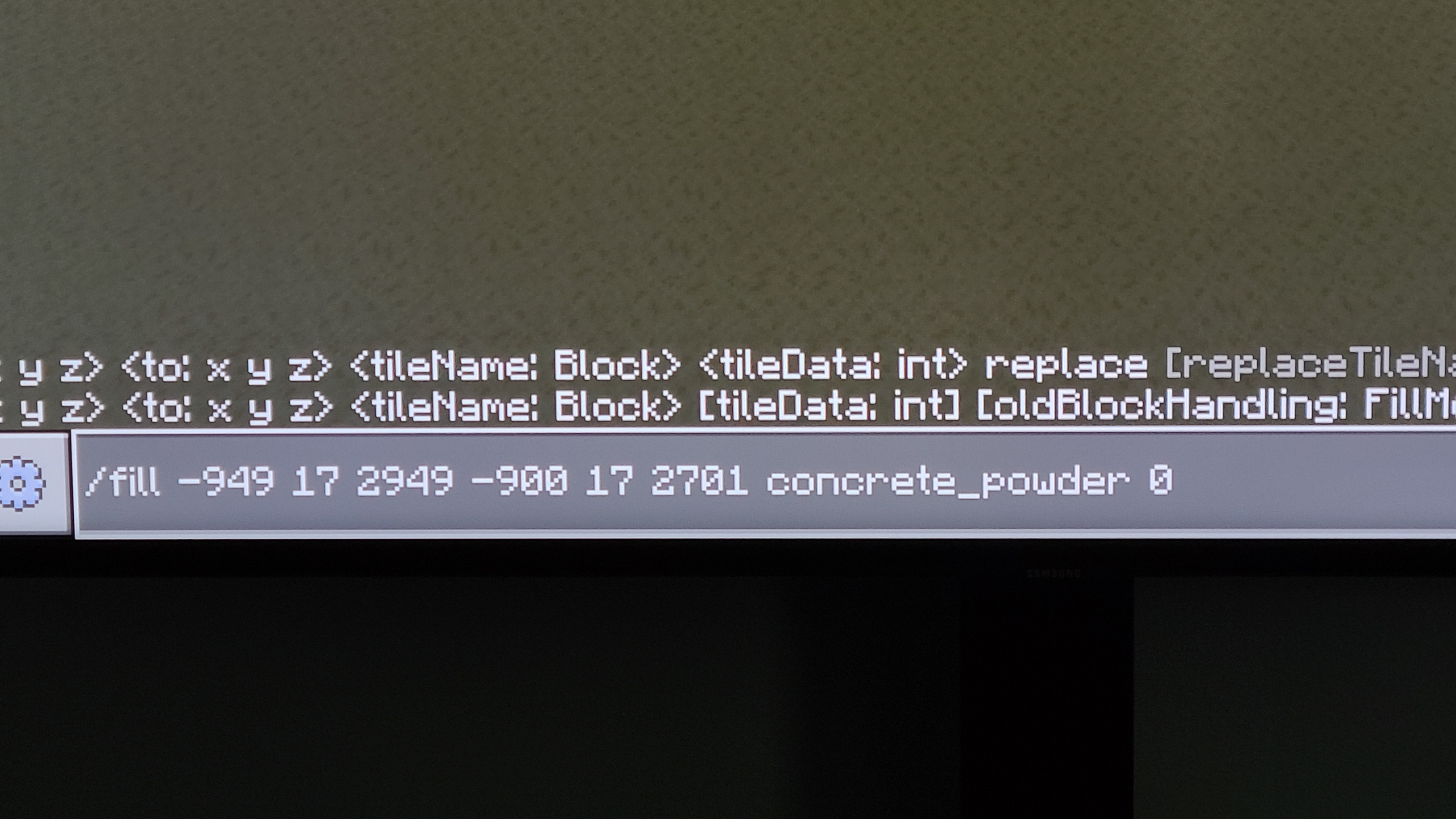 2) Open the chat command and type in the X,Y,Z coordinates for the first position and the second position where you want to fill in the blocks