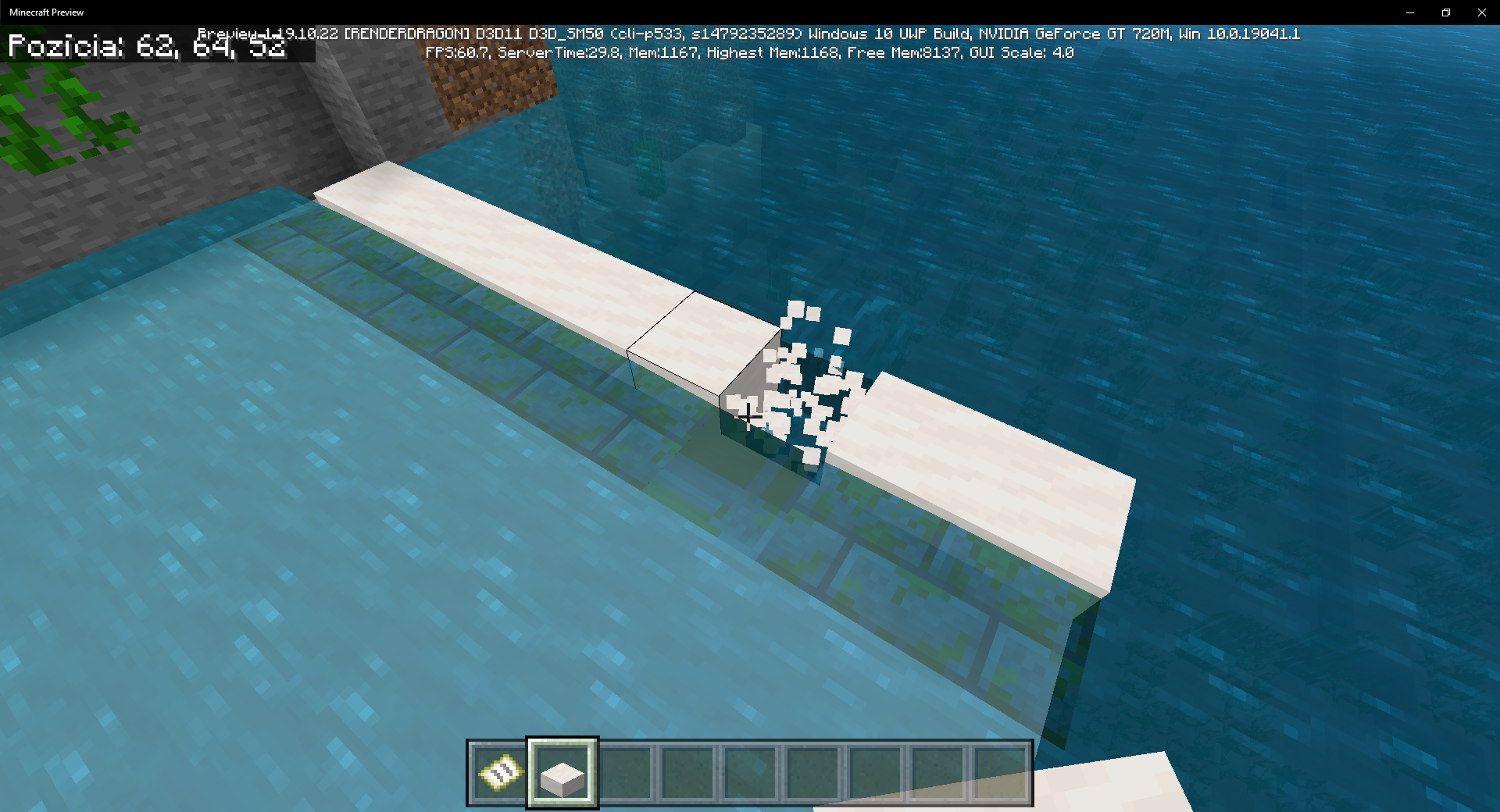 I found this visual glitch which occurs when you place whatever slabs by specific way on the water. On the water surface appears 1x pixel tall mossy stone brick texture polygon.