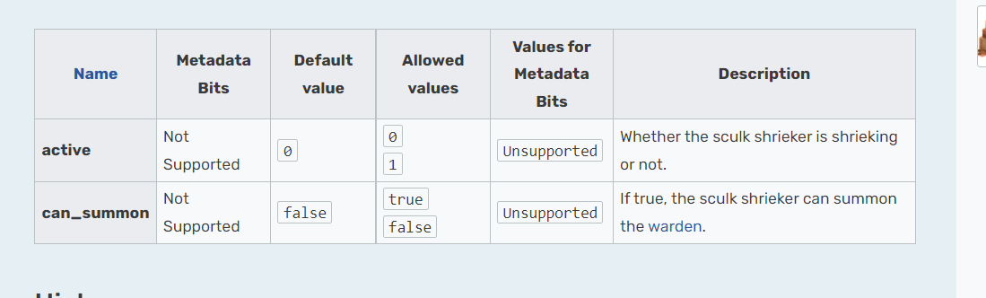 I tryed to give myself a sculk shrieker that can spawn a warden. Whatever I do I can't use /give to optain a skulk shrieker that can spawn a warden, it just keeps giving me normal sculk shriekers that can't spawn a warden. Even with an item editor it is not possible to obtain a sculk shrieker that can spawn a warden, since the sculk_shrieker is reset to a non warden spawn one when it is optained in item form. The screenshot is from a minecraft wiki, it tells me that the sculk shrieker that can spawn the warden is not obtainable, because the code for the item form of the warden spawn sculk shrieker is missing.