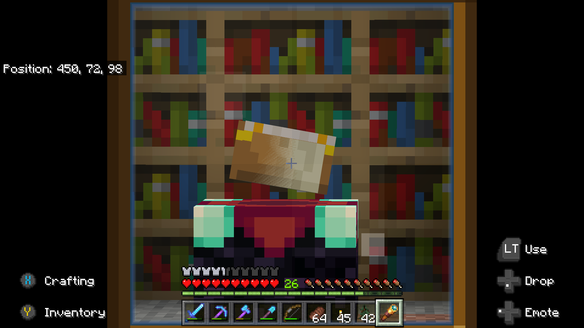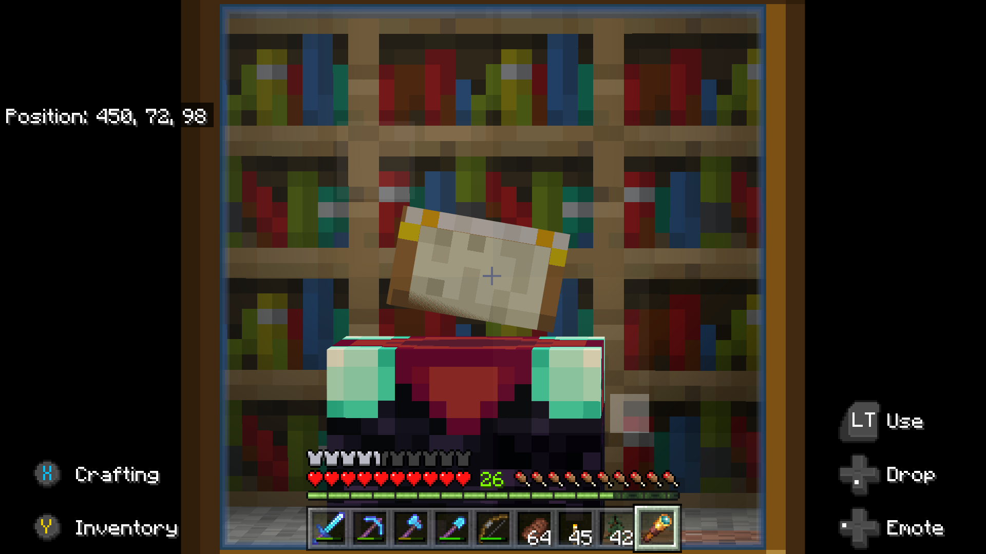 When further than 10 blocks away from an enchant table, z-fighting will occur sometimes causing the cover to disappear or half of it to go missing. It distracts from gameplay with the book bugging out in the corner of my vision. I never noticed it before but this is on a locally hosted LAN/friends list world (If that has anything to do with this)