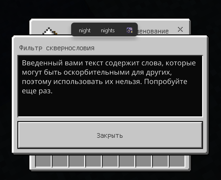 Can't type night into the anvil - first 3 letters triggers the filter. Minecraft shouldn't bring the window, just don't allow to finish until no swears etc are in the text field
