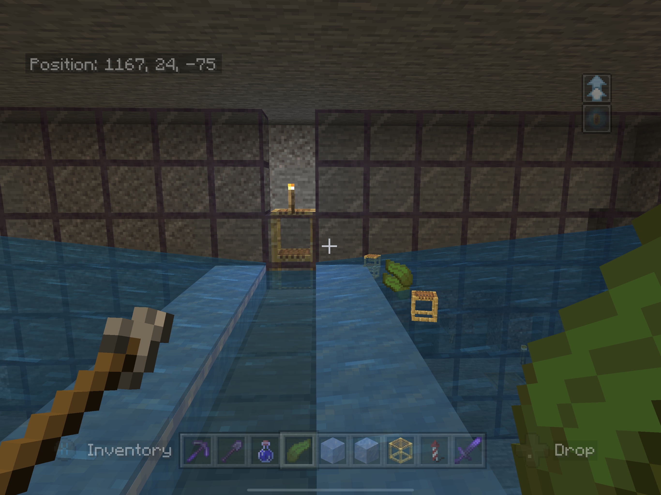 Observed results: drops get stuck on the edge of the wall and do not flow over (items do not seem to float up into the flowing water to be moved up and over).