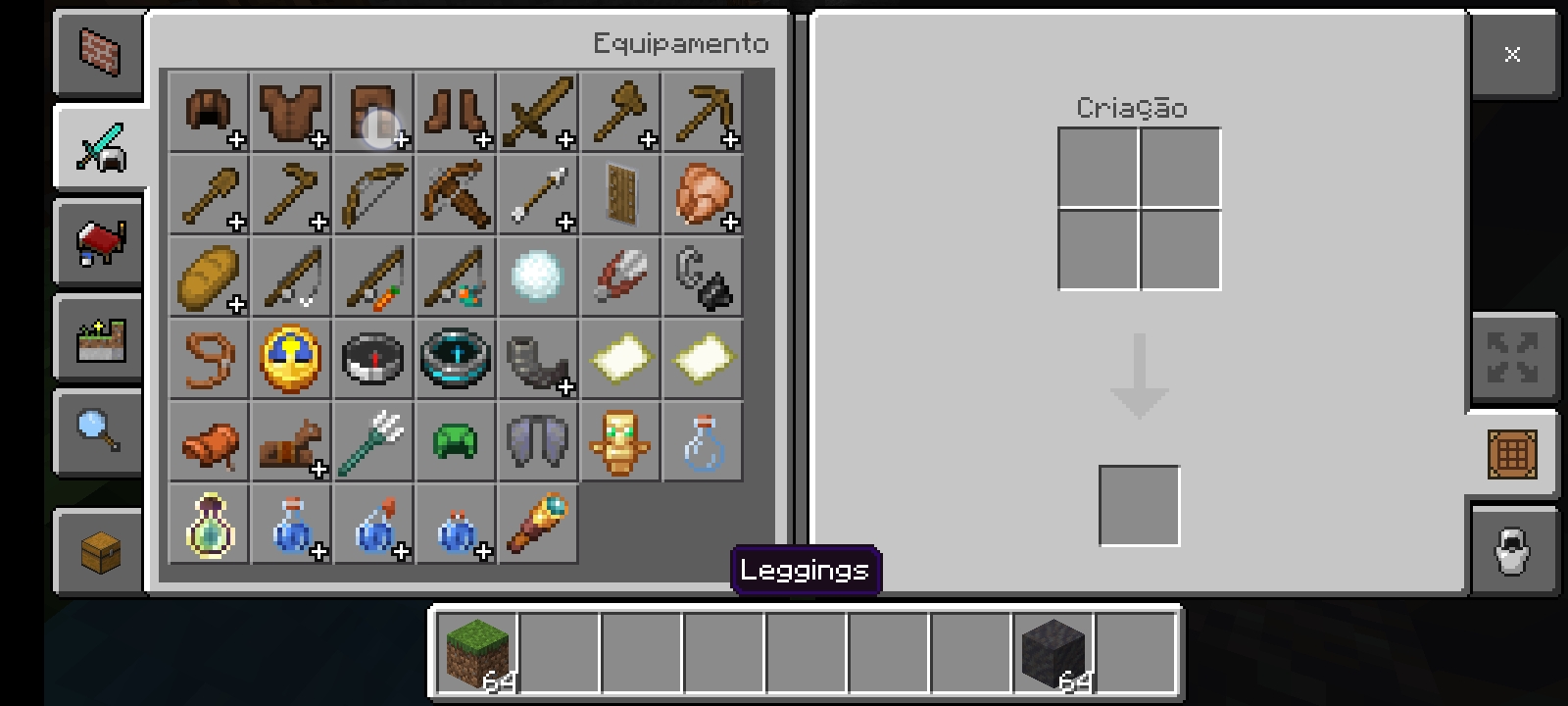 There is an error in the translation of the word "leggings" in the player's inventory, since the word is not translated into Portuguese as "calças"