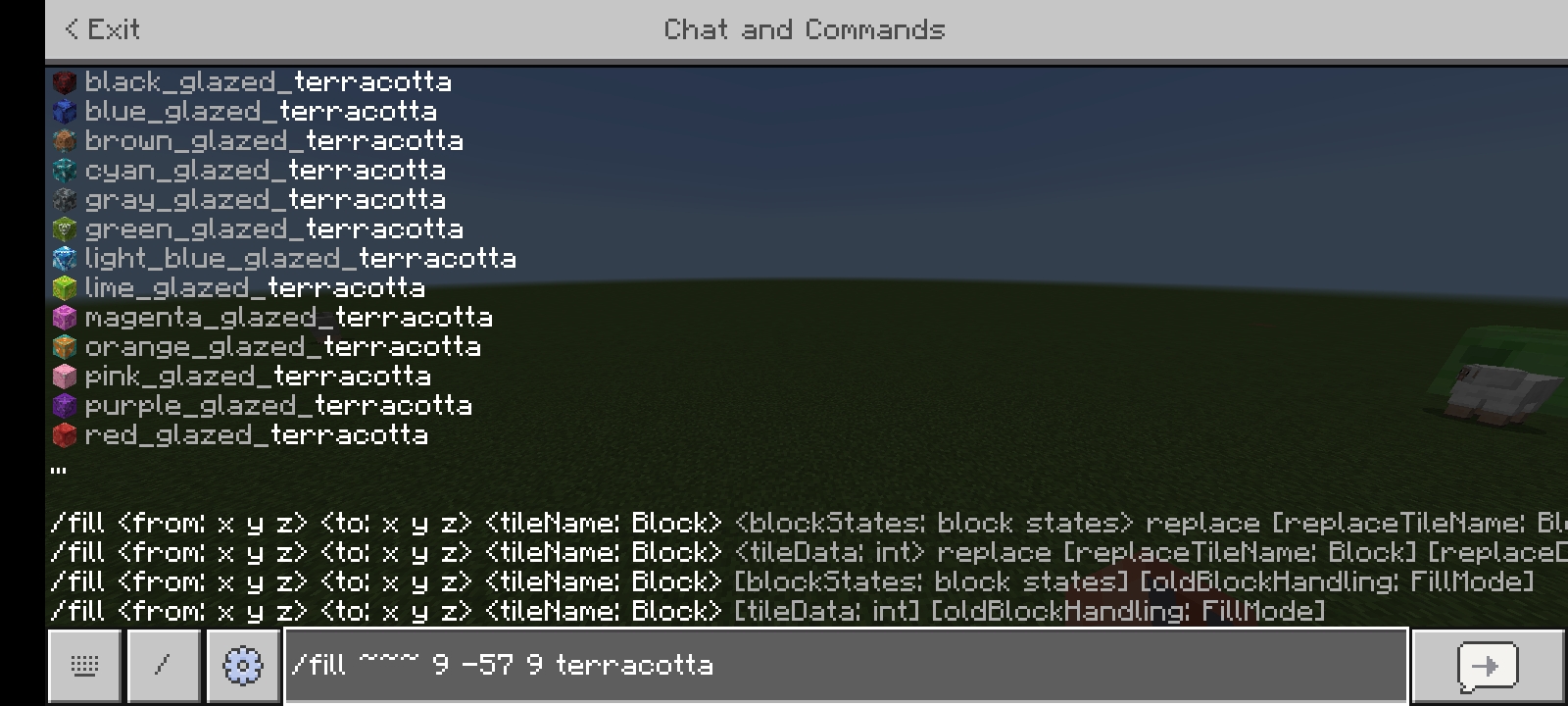 The pictures below describes it all. As you can see colored terracotta blocks,wools, concretes,concrete powders are missing in commands. I tried with every other terracotta and all of them are missing.
