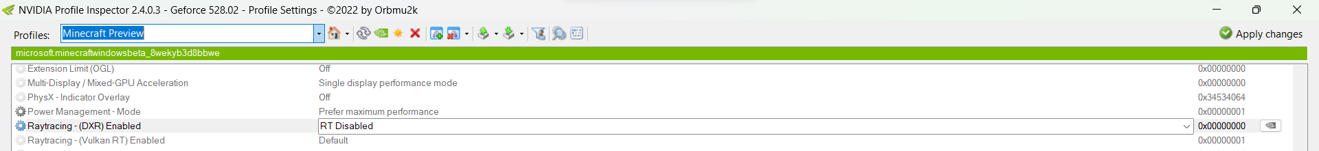 The game will report that your device is incompatible with RTX, however you'll now have performance that matches a non-RTX GPU! If you ever want to use Ray Tracing, just change the setting back to "Default" and the in-game option will be unlocked. For some reason the Minecraft profile in Nvidia Profile Inspector doesn't affect Minecraft Preview, so to test D3D12 on that version of the game you'll need to temporarily disable DXR on the global profile and re-enable it when you're done.