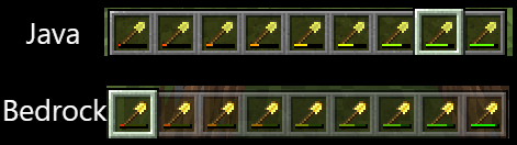 The durability bar on Bedrock edition has a worse look comparated to the Java Edition's one, the shading of the green pixels to red are worse and it is also harder to notice the colored pixels because they get darker as the durability decreases.